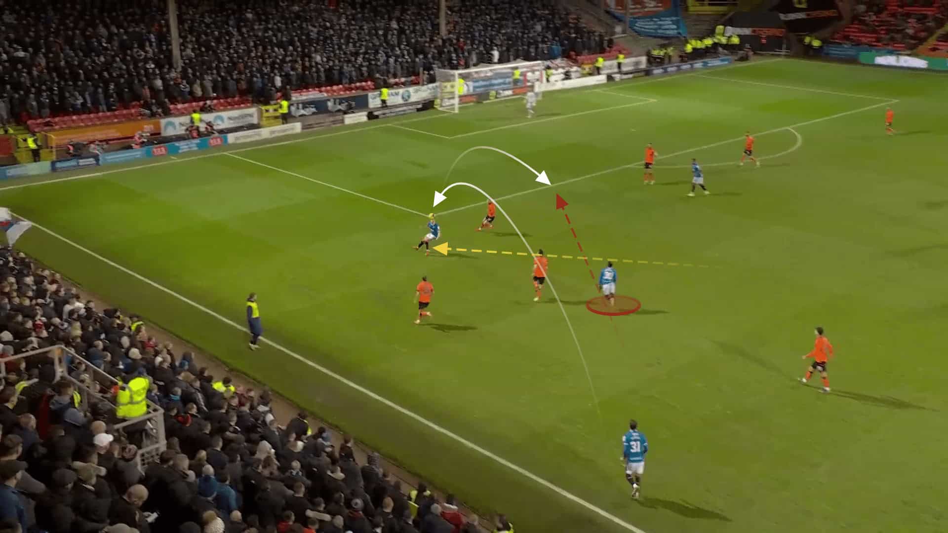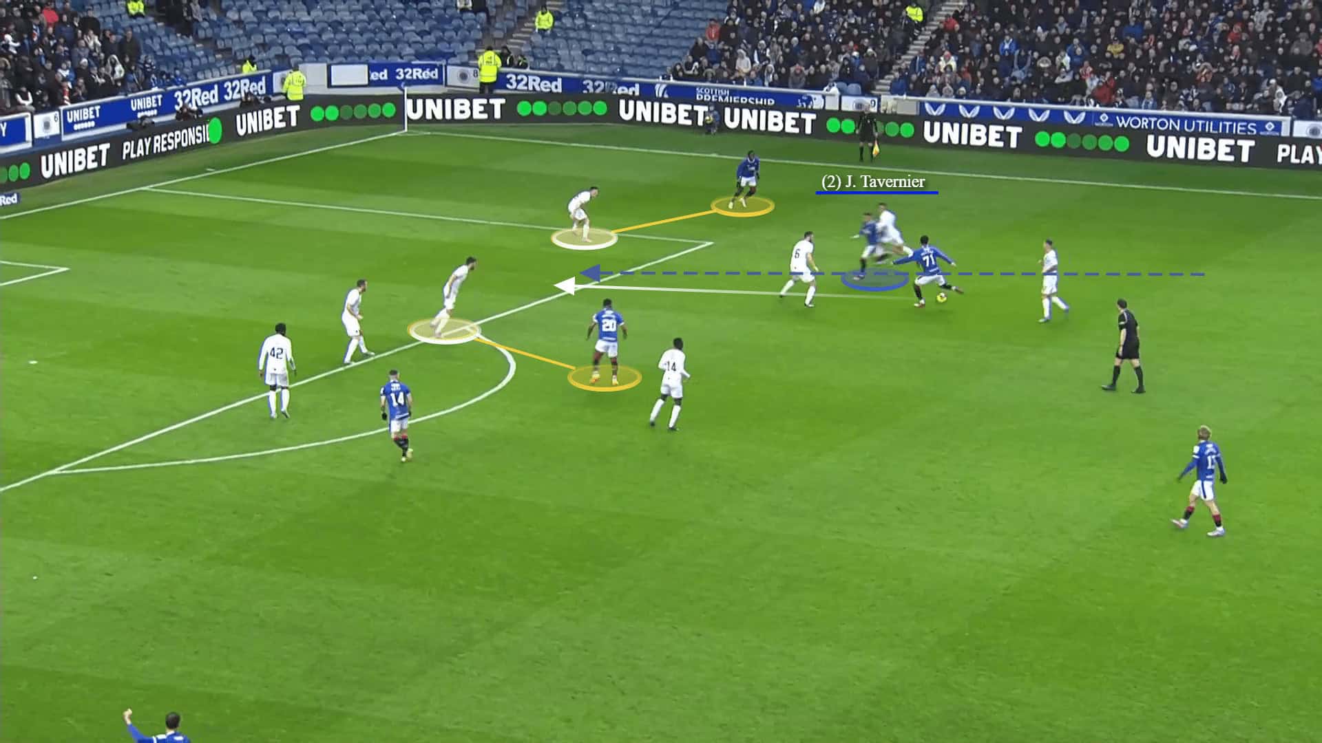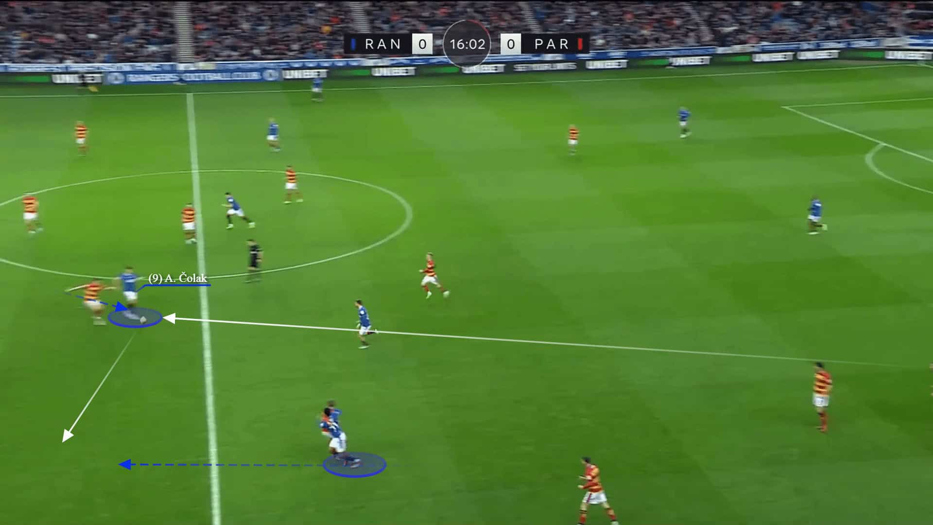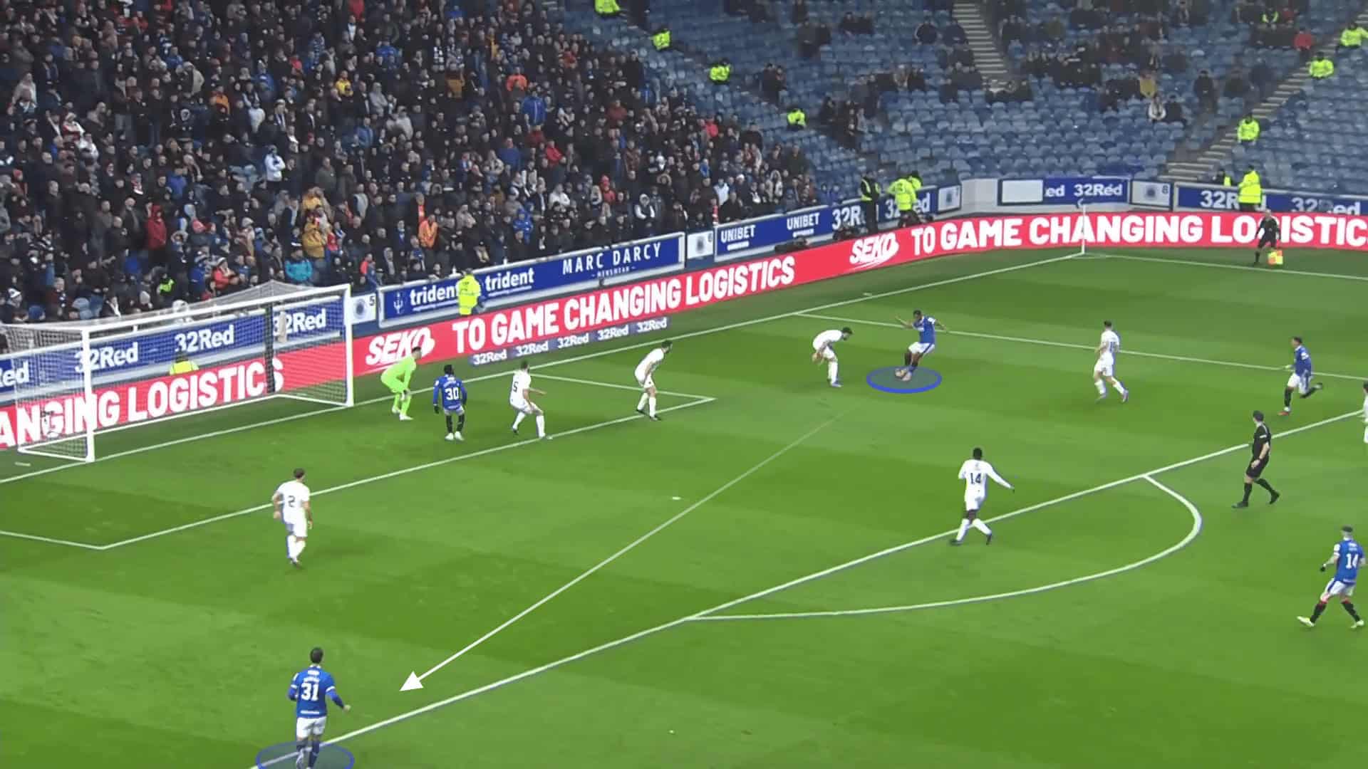 Rangers, here below, are overloading the right-hand side under the same conception of Beale’s freedom and fluidity. Controlling the flank with four players with an option to circulate to the weak side and an aid from the dropping striker creates a numerical advantage and provokes the opposition’s centre-back to leave his position.