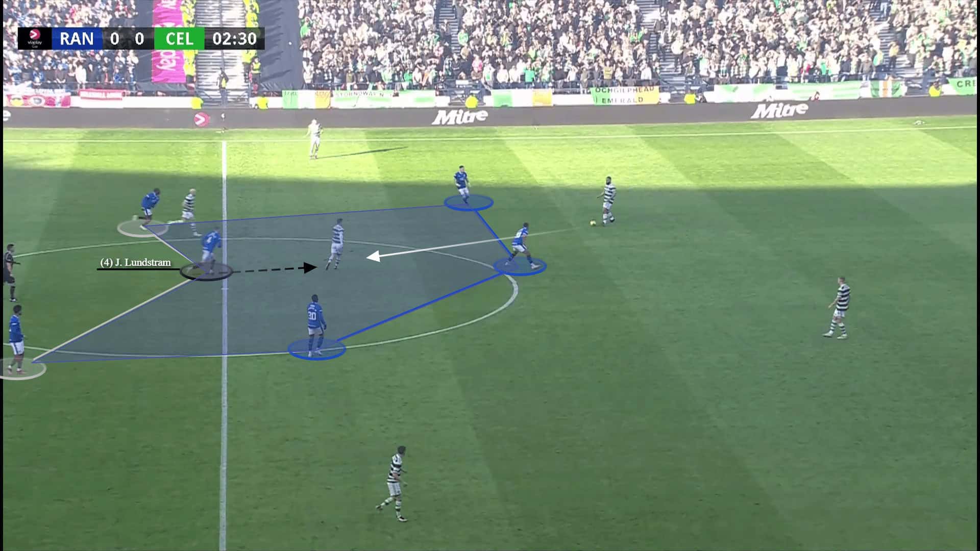 Celtic’s No 6 who could receive the ball with his bad body orientation, considered as a pressing trigger, is trapped, and Lundstram is ready to press him immediately. Furthermore, if the ball would reach the fullbacks, Rangers’ no. 8s are ready to move to press with the inside winger, using the touchline as an extra defender.