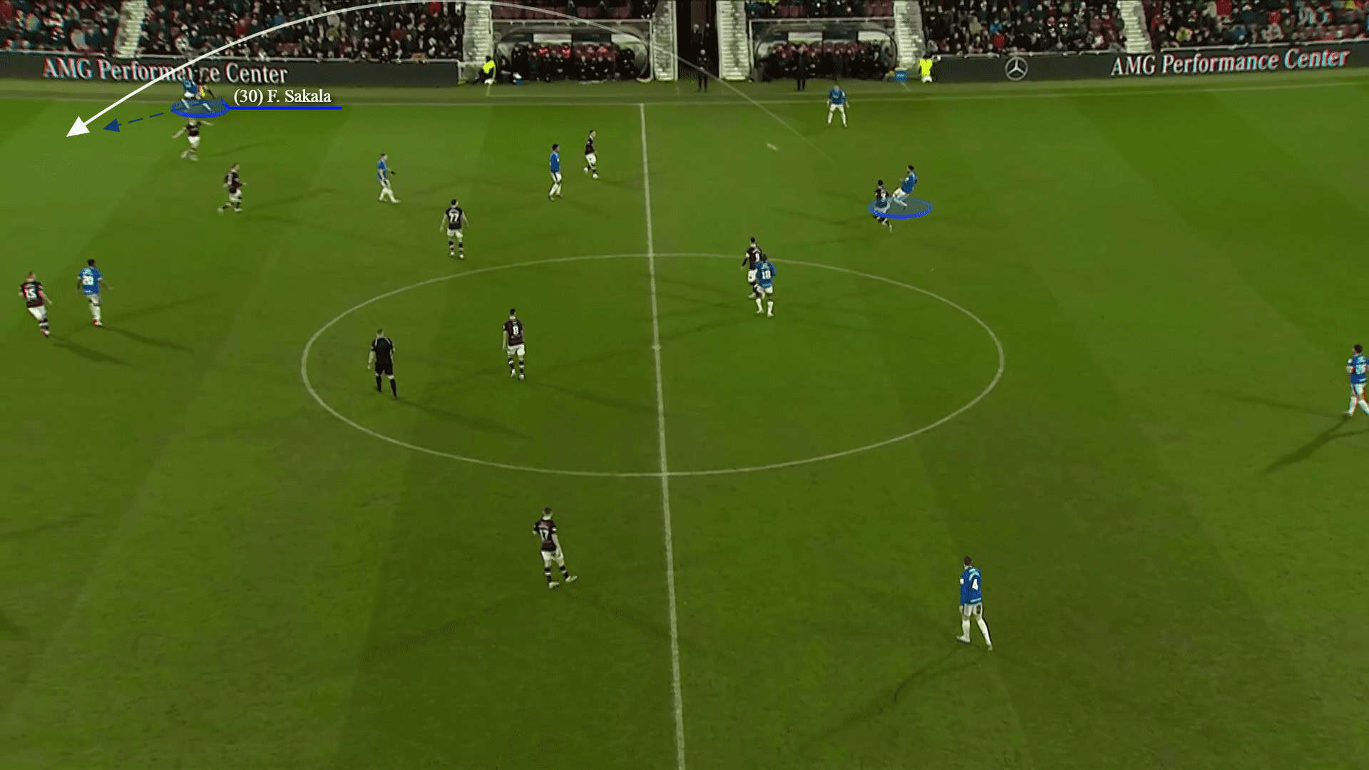Rangers’ forwardness is not only playing through the defensive block but moving above the opposition by executing long balls to the out-wide wingers is a solution. Here, below, Sakala receives the long ball in behind the backline from the centre-back and gains the dynamic advantage over the opposition’s fullback.