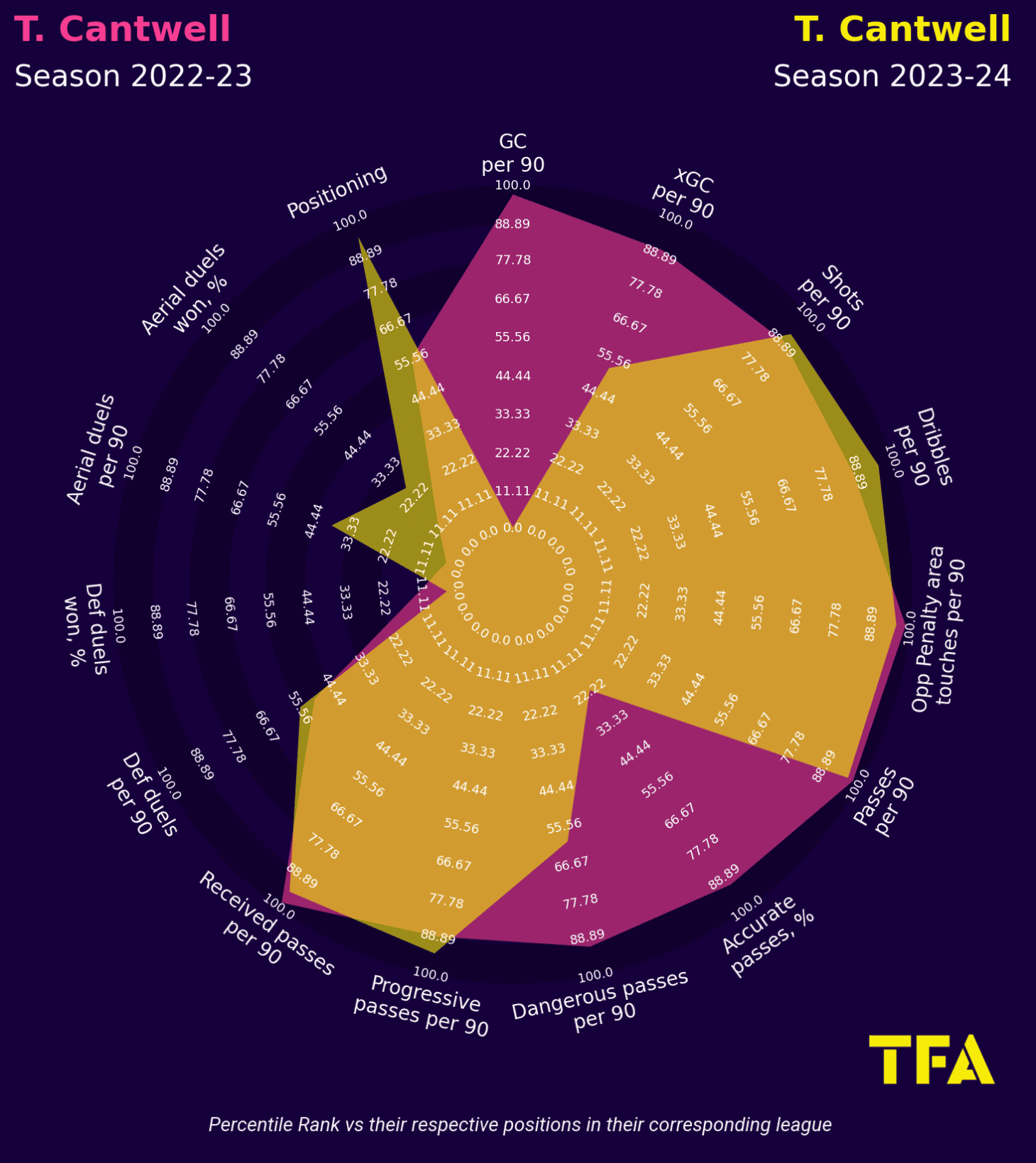 Cantwell flourished at Ibrox following his arrival from Norwich City in January 2023, mainly playing in a no.10 role. Beale opted, however, to utilise Cantwell more on the right side of midfield this season. The radar chart shows that the positional change has markedly reduced Cantwell’s attacking play this season, ranking much lower for goal contributions and dangerous passes per 90 than last season.