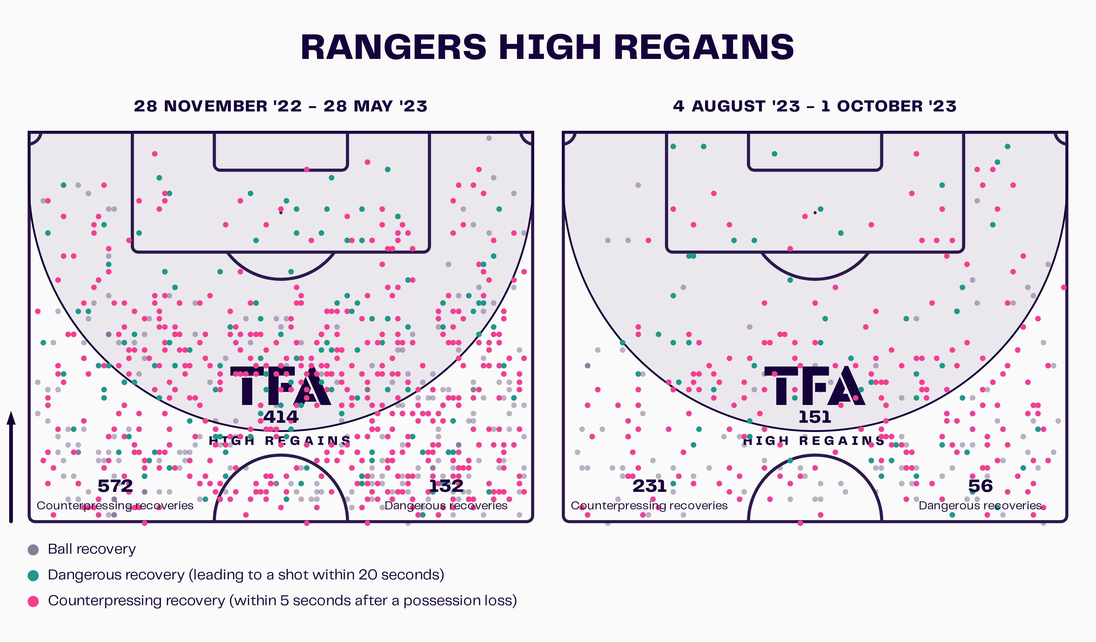 However, the evident lack of cohesion between the midfield and attack this season further thwarted Beale’s preference to “own the pitch” as the press led to fewer regains overall this season in more advanced positions.