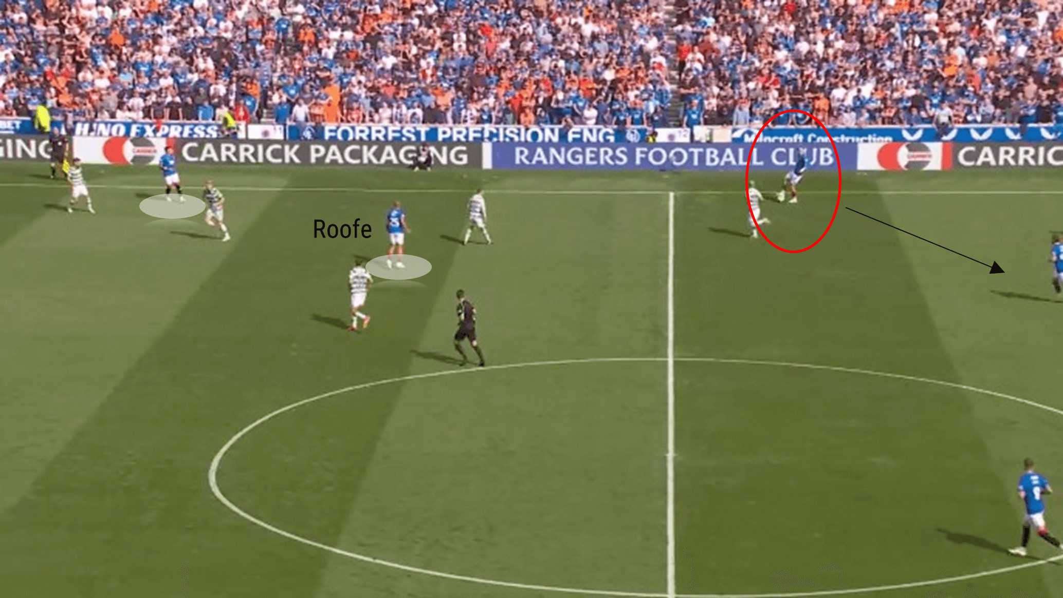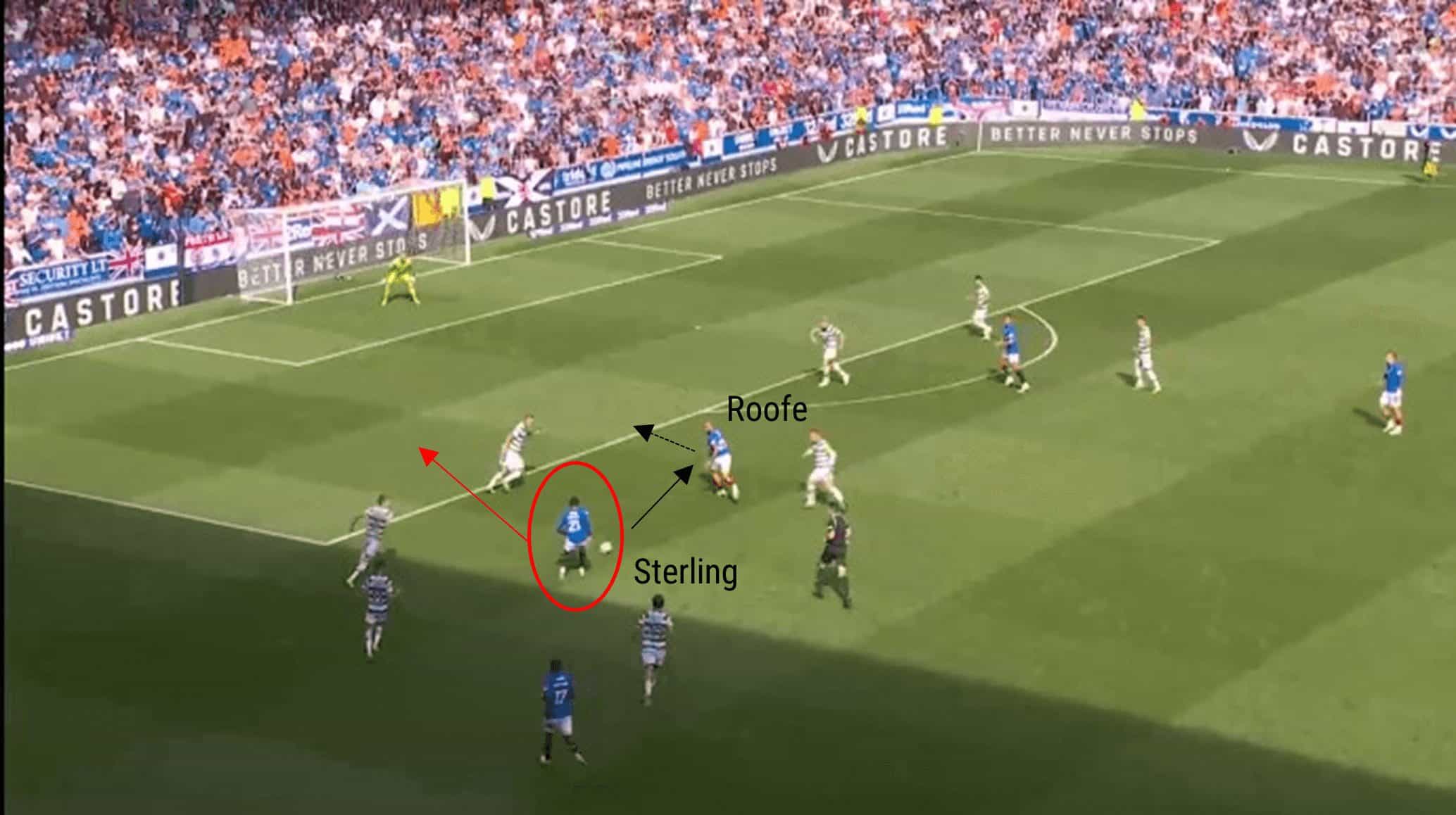 Rangers eventually work the ball out to the left, and Dujon Sterling cuts inside, but instead of playing a through pass for Roofe to run onto, Sterling plays it directly to his teammate’s feet. Roofe subsequently loses control, and Celtic regain possession.