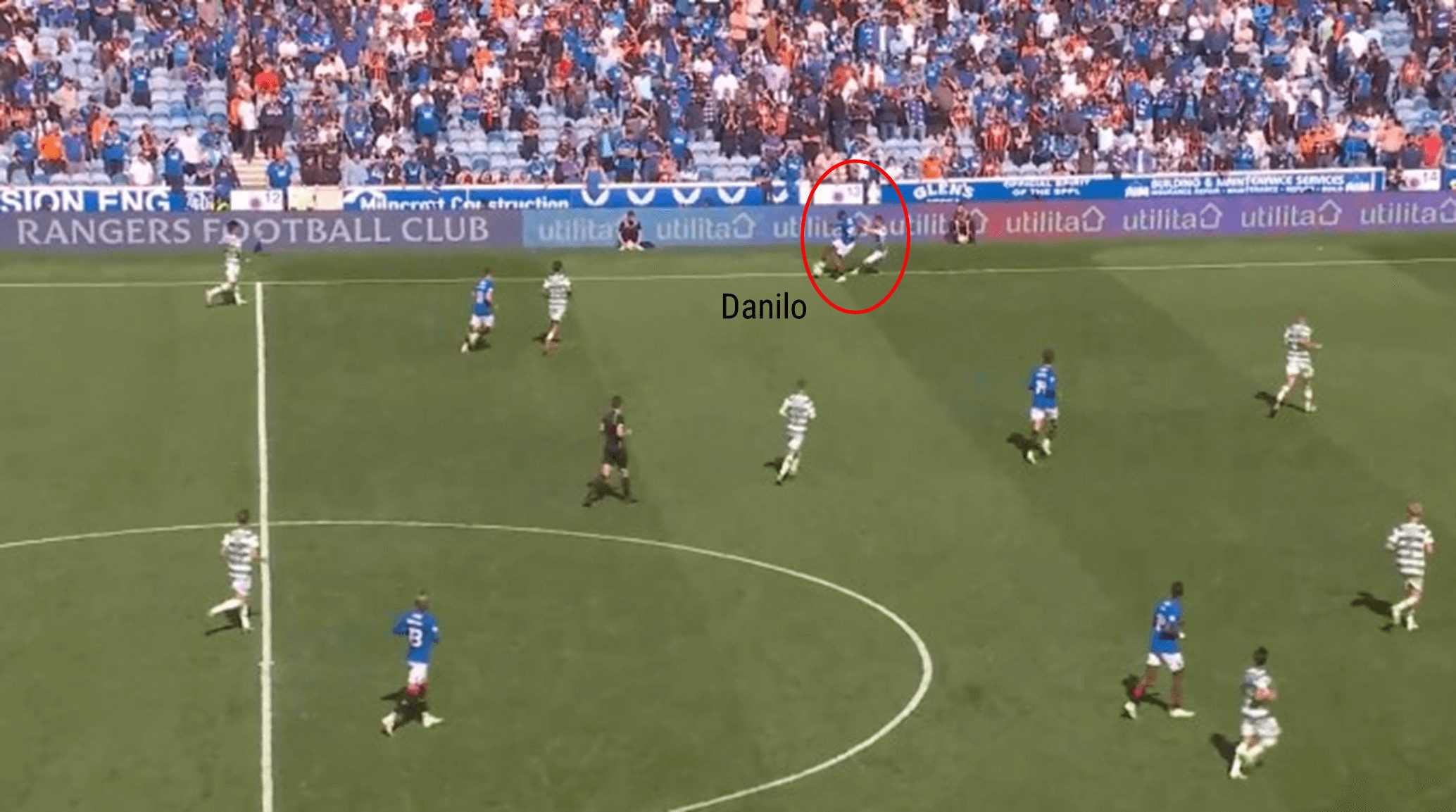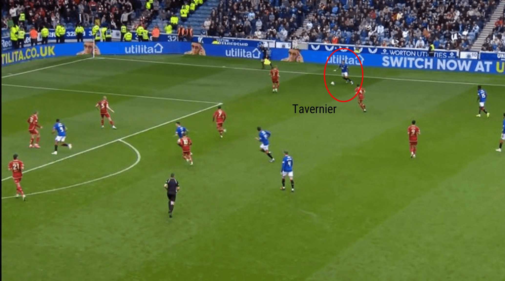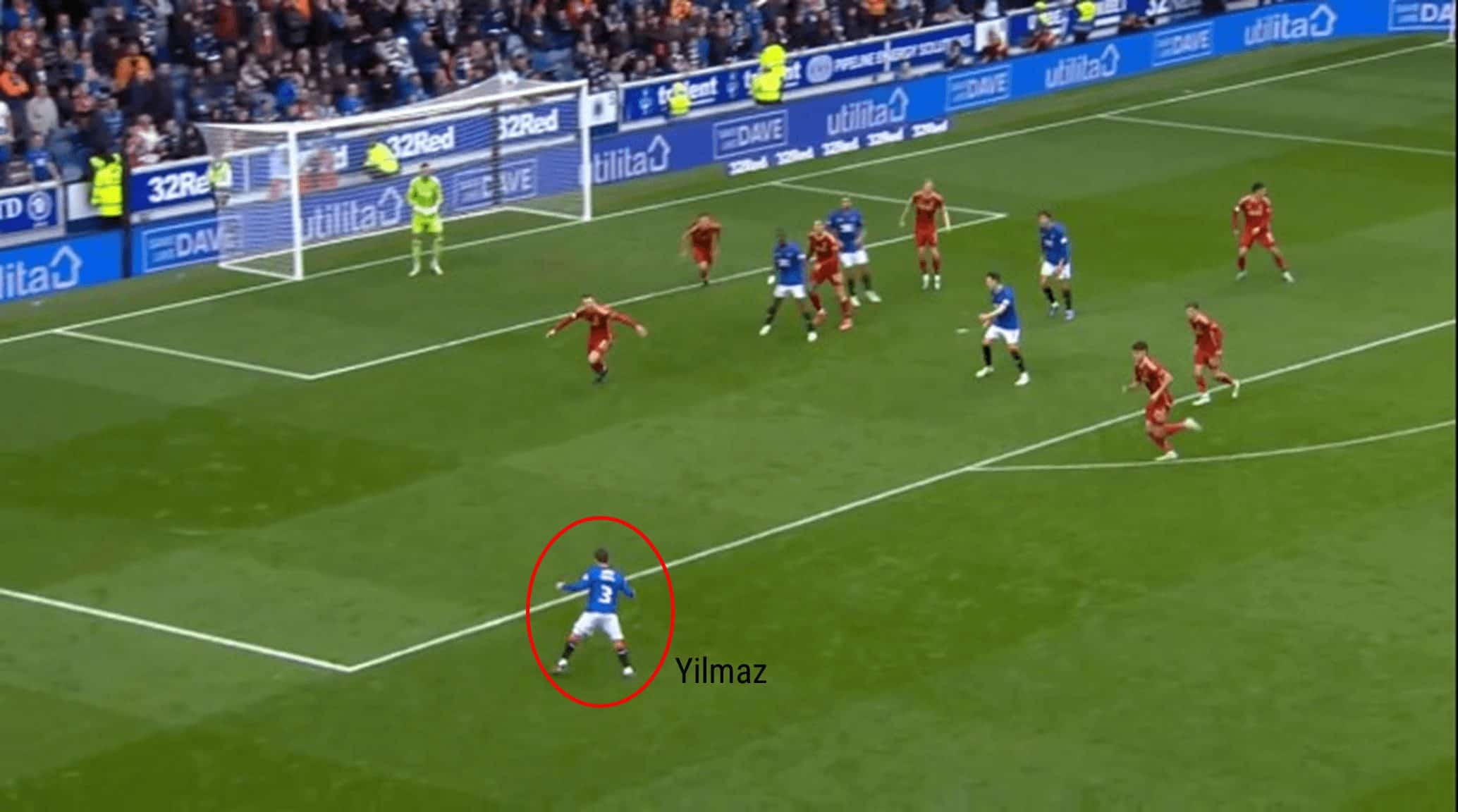 Although Tavernier’s cross is cleared, the ball eventually finds its way to the Rangers left-back, Ridvan Yilmaz, who, like Tavernier, is advanced to then provide another ball into the area for the Glasgow side. It is demonstrated that the Rangers’ full-backs are accustomed to advanced positioning to assist in attacking phases of play.