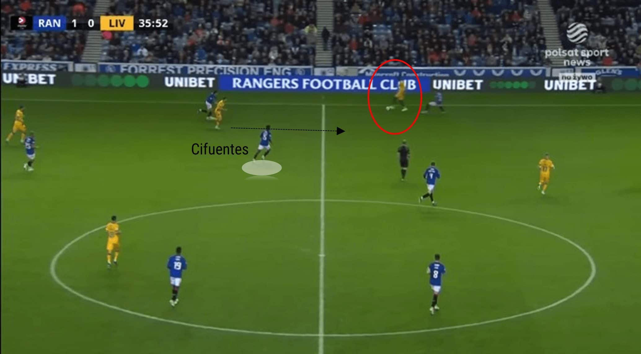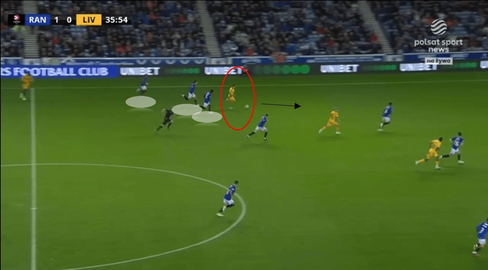 In the above match still, Rangers are in possession of the ball on the right-hand side. However, a lack of movement by Kemar Roofe ensures the Rangers forward remains surrounded by the opposition. Consequently, the ball is not progressed forward and is played behind, across the defence.