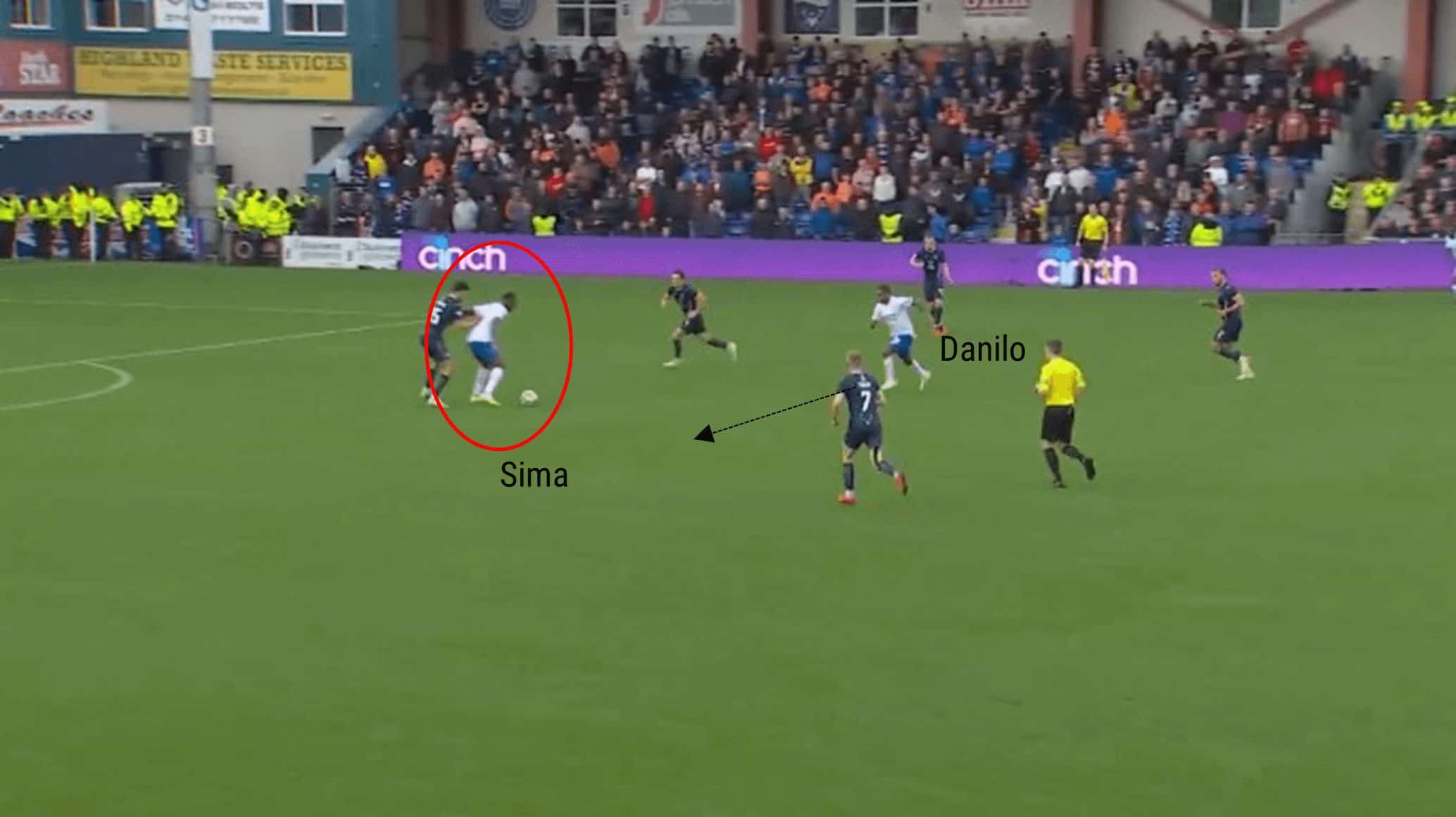 Abdallah Sima is in possession of the ball with his back to goal, drawing the opposing defender to follow. Danilo is advancing towards space, ready to link up with Sima.