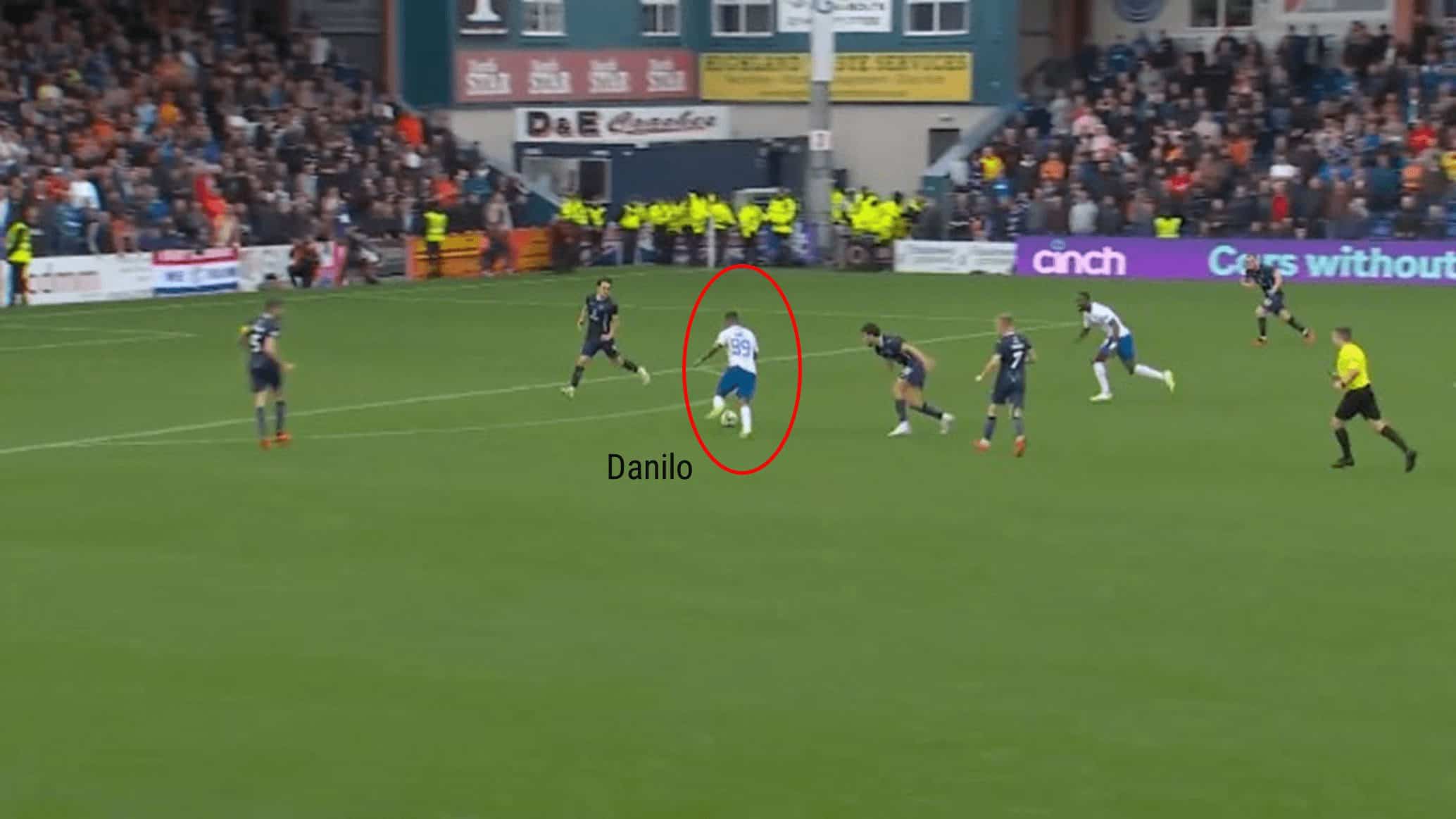 In the above image, Danilo receives the ball on the left-hand side under pressure from the Celtic defender. Danilo is unable to keep possession of the ball and is tackled.