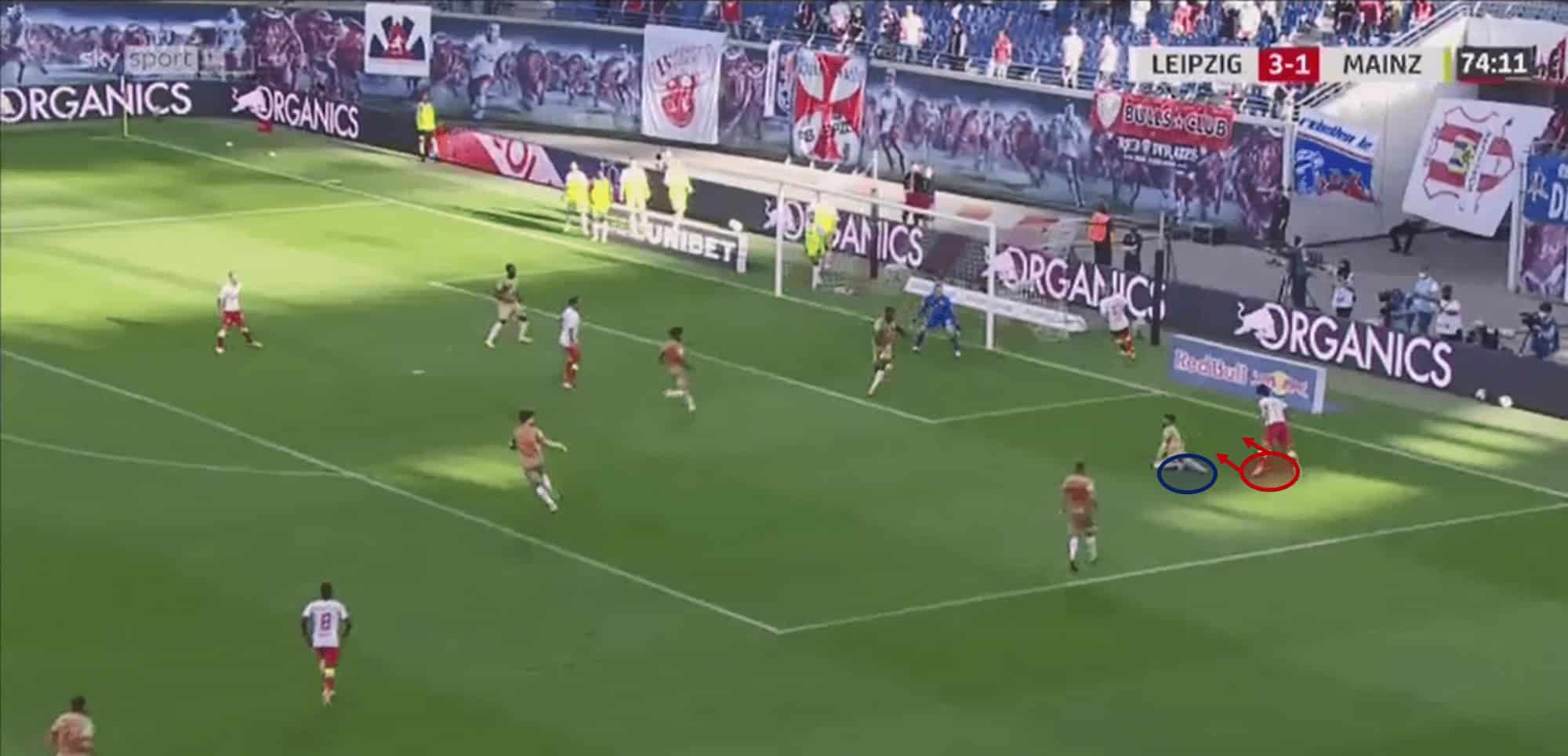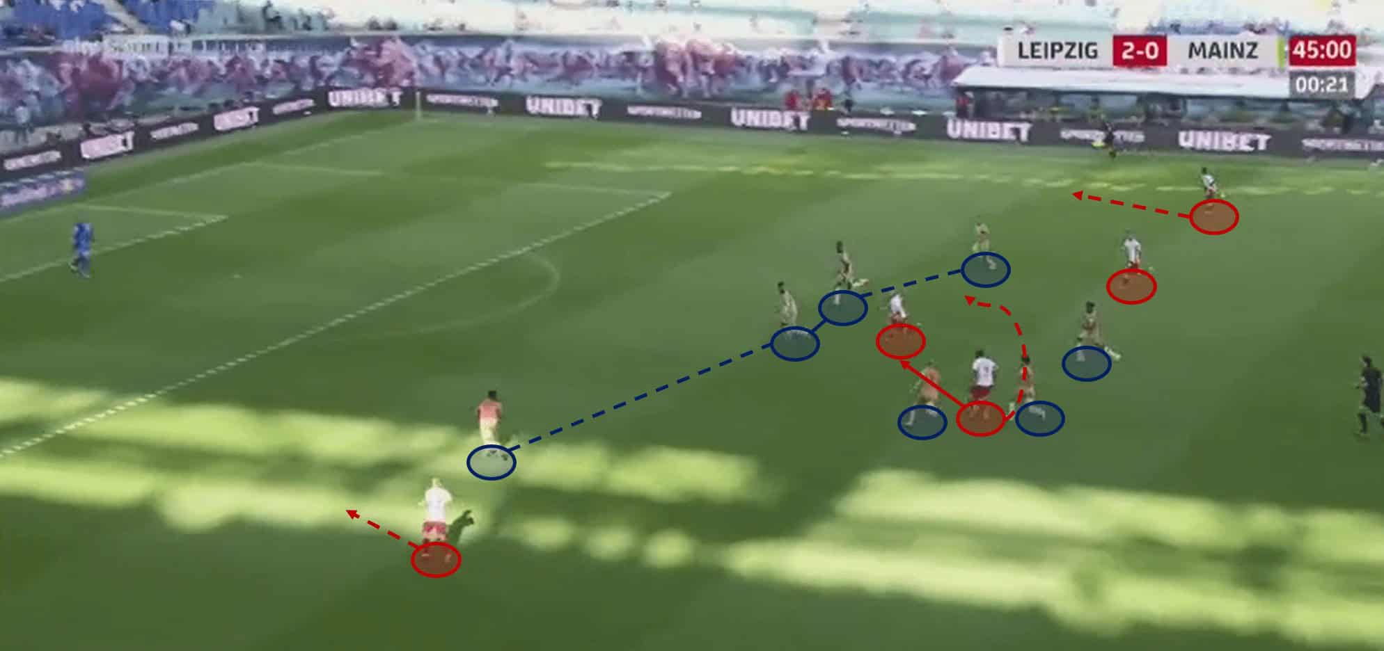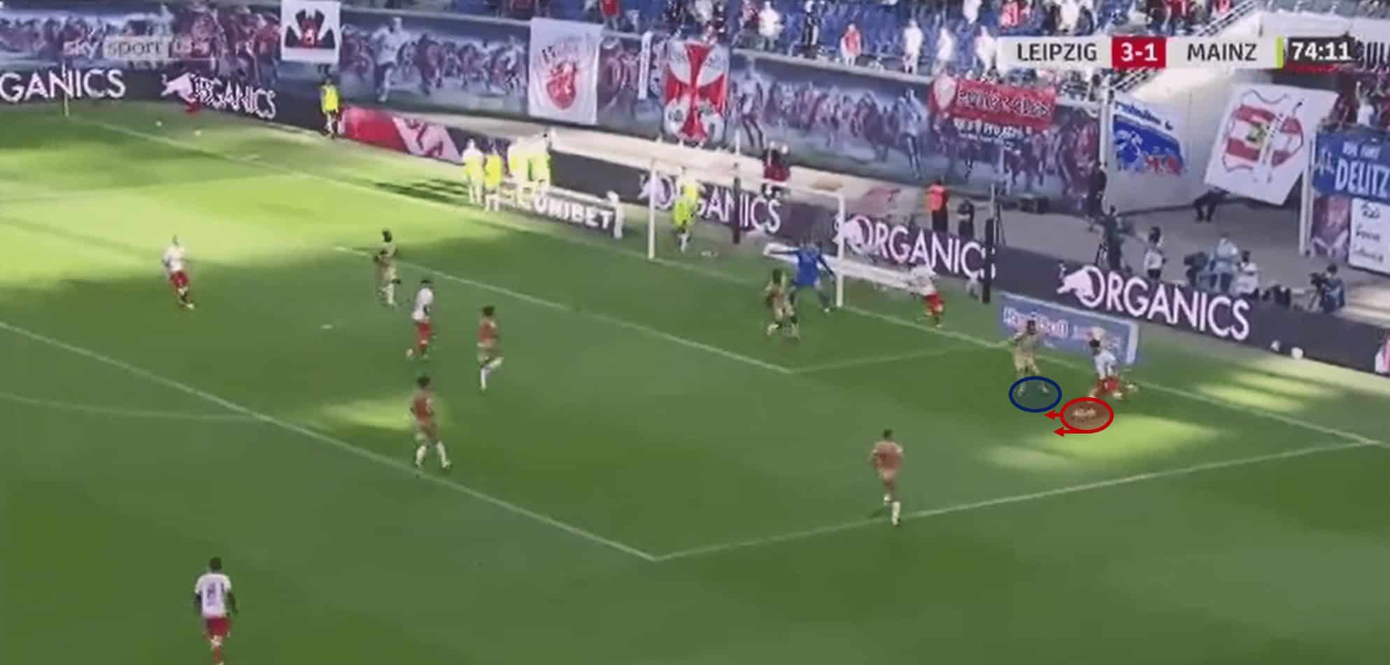 Poulsen carries the ball, passes it on towards Forsberg, and makes the angled run between the left centre-back and left-back. This is ball progression with purpose, as seen by the several attacking options for Leipzig.