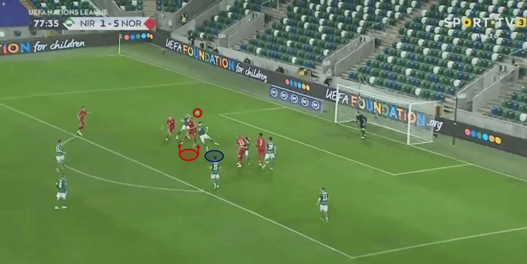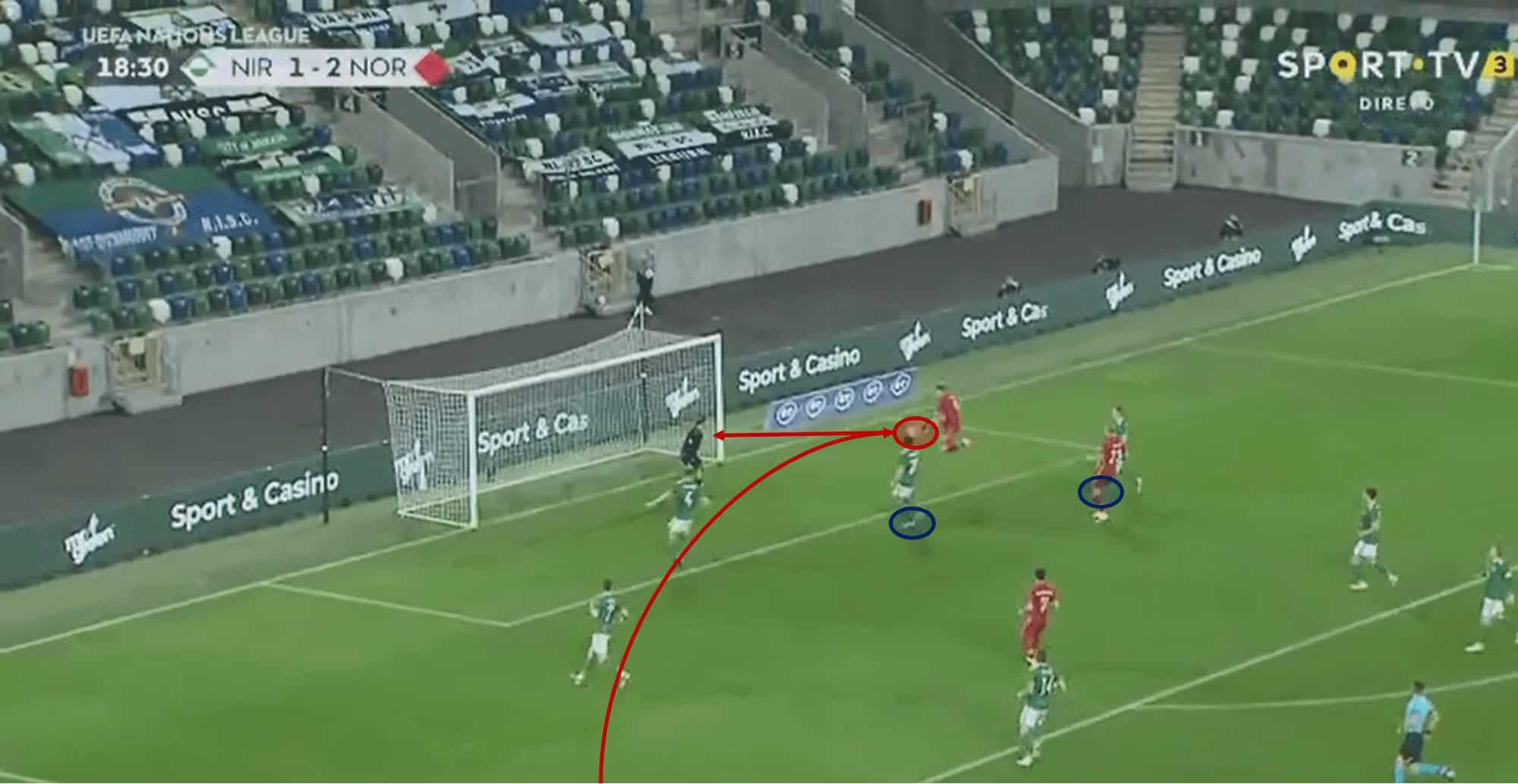 Above, we see Sørloth display his remarkable leap and timing of said leap to reach the ball before the Northern Ireland defender.