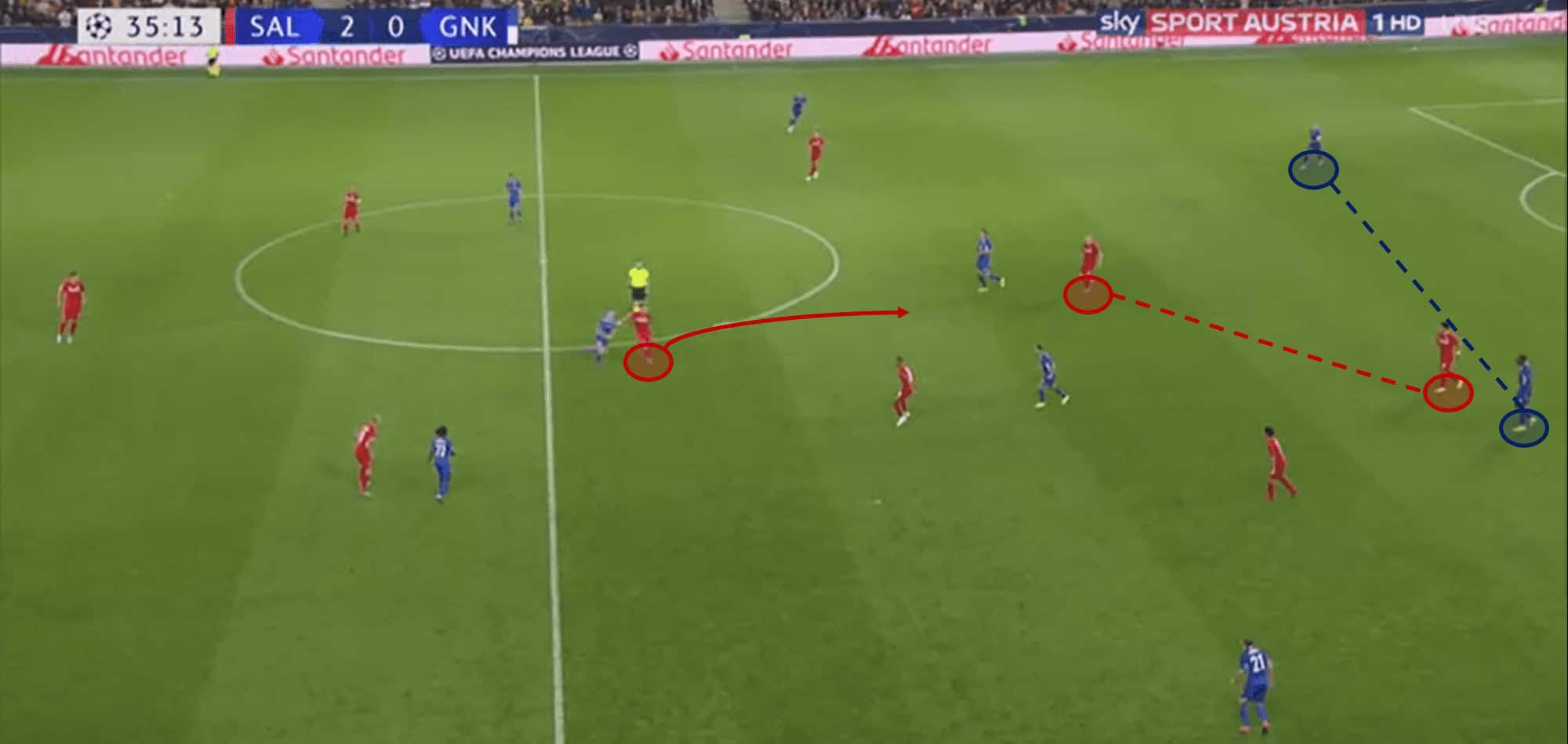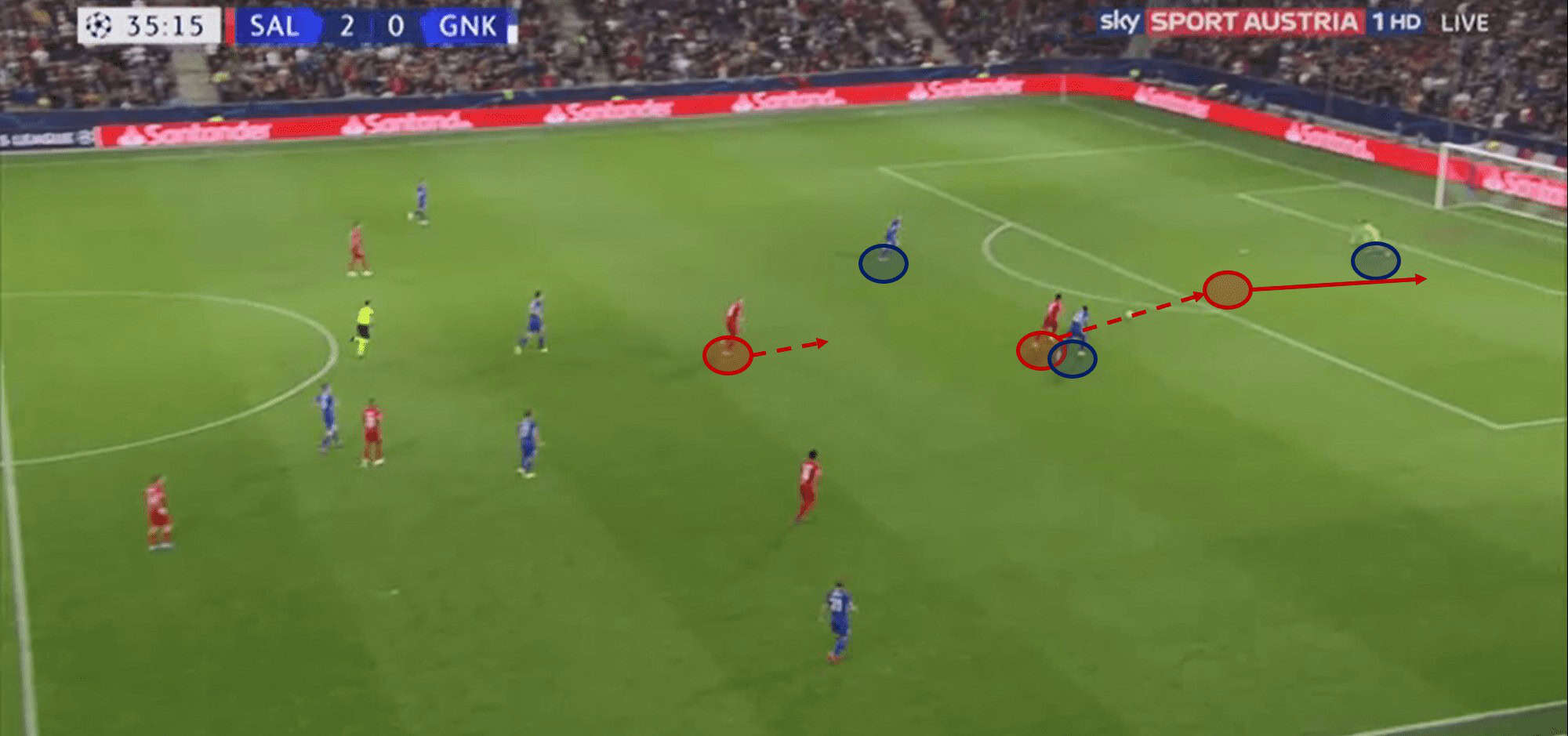 The 24-year-old is an intelligent footballer who likes to operate in the half-space. Last season at Salzburg, he was mainly used on the left side of a front two. He would position himself in between the right centre-back and right-back and would time his run looking for a through ball from his teammates. He is excellent at a diagonal run where he orientates his body to generate the speed and timing to gain an advantage over the opposing defender. A typical scenario can be foreseen where Poulsen has dropped deeper to win the ball, lay it off to a midfielder, all while Hwang is making one of smart runs in behind, for one of Leipzig’s more progressive midfielders to reach him with a through ball.