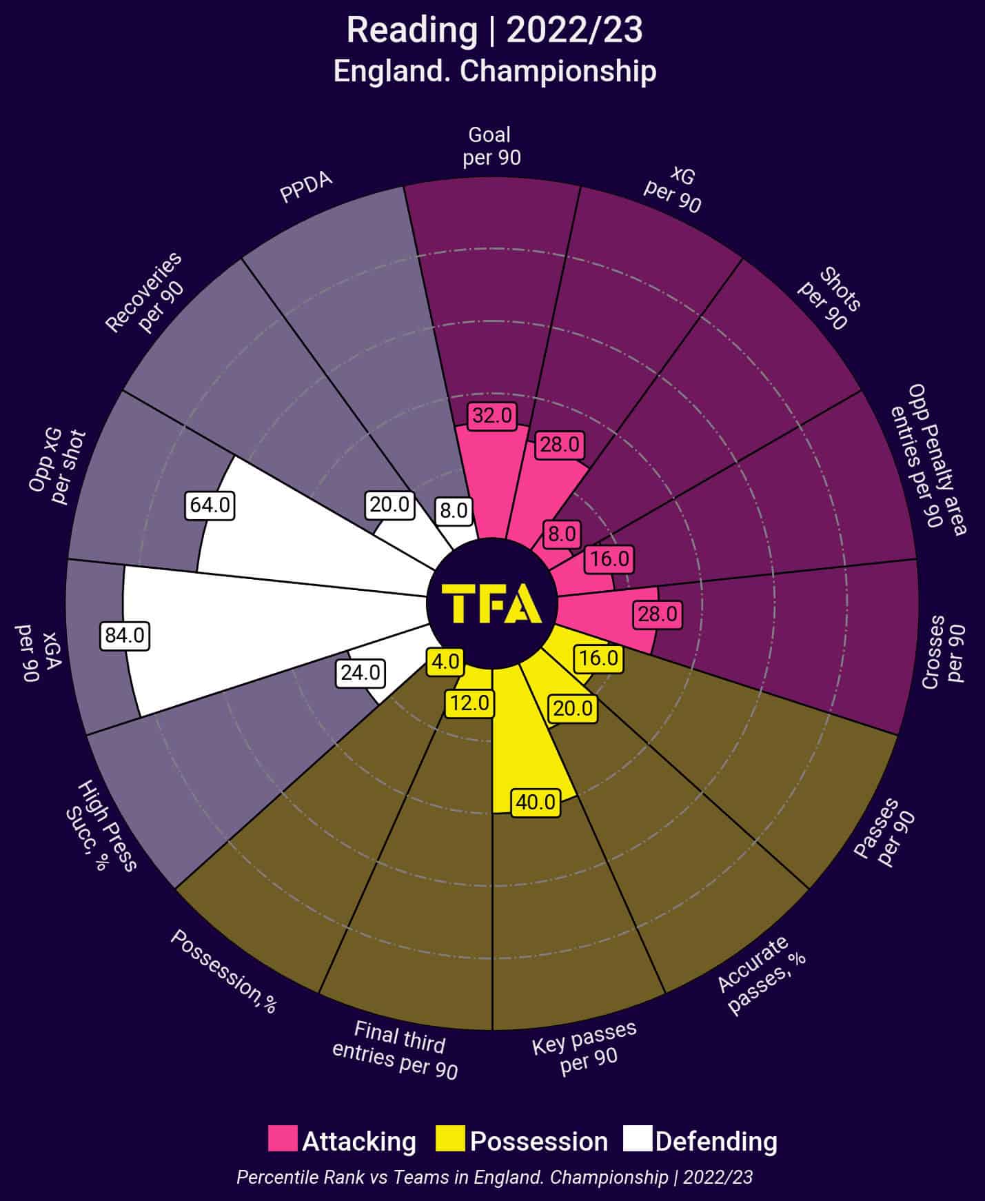 In the following Pizza Viz we can see how Reading likes to play football under Paul Ince. As other teams in the league like to play in a possession-based style with lots of passes and talented players that bring quality and magic with long retentions of the ball, Ince counters with a low block and a very direct style that looks to harm rivals in big spaces and in the defensive transitions, attracting almost all the team to their own third.