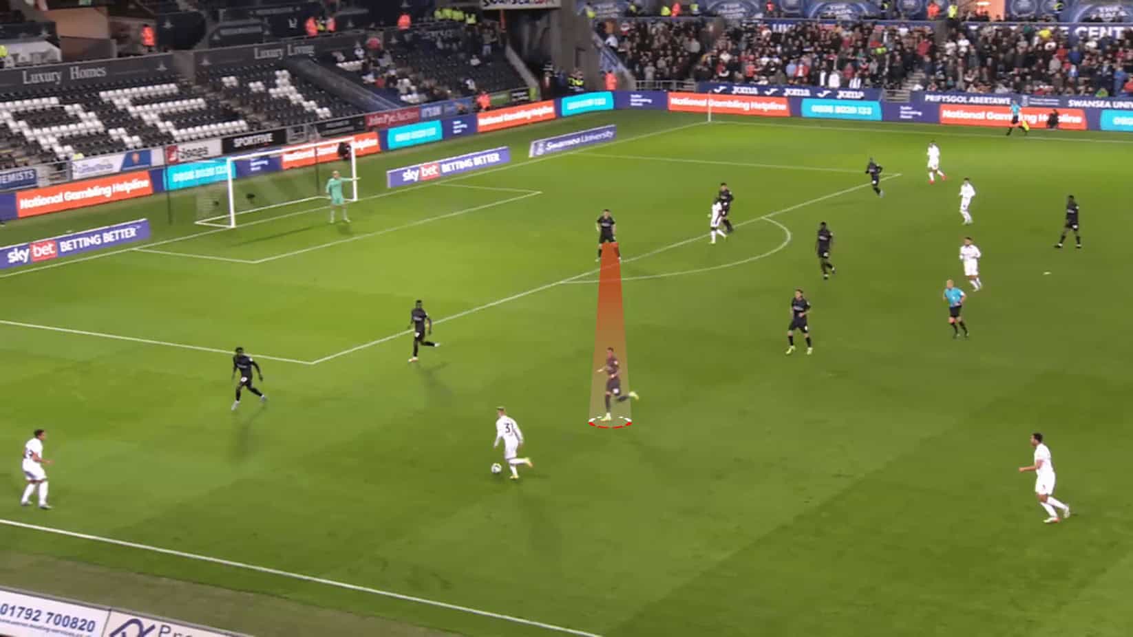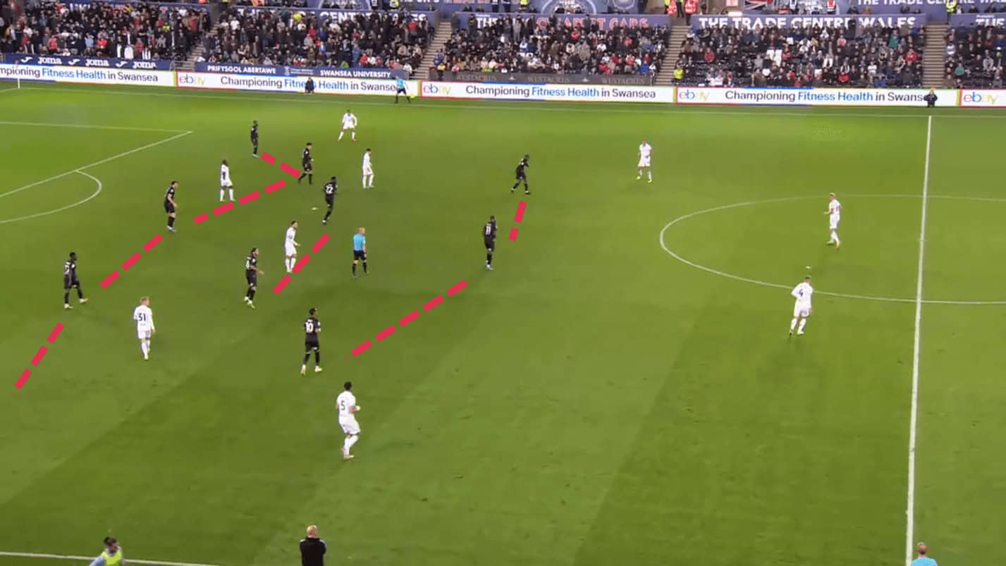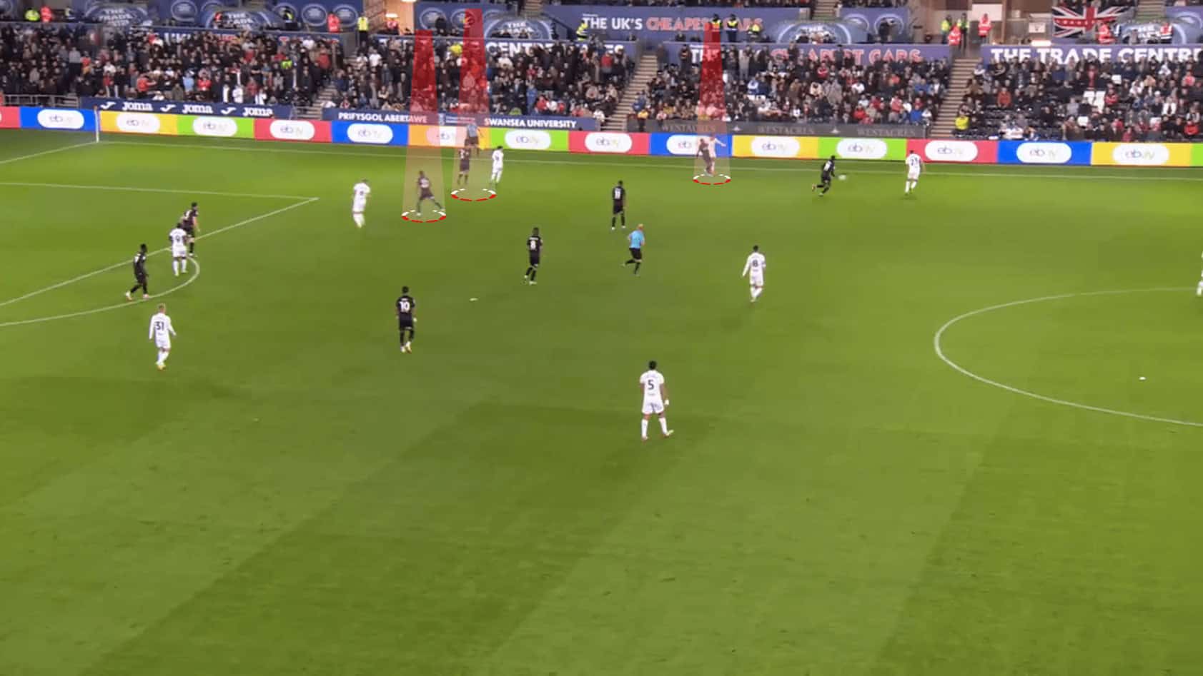 After the pass is played to wide areas, full-backs are very aggressive to go and tackle players to win the ball back. As Reading overload central areas with their narrow shape, wing-backs need to be precautious with passes that are played to the wings. So these three movements are repeatedly seen, mostly on the left-hand side of the pitch. The left centre-back goes off to cover the free-man, in this case, the right-attacking-midfielder of Swansea. The defensive midfielder Mamadou Loum tracks back to cover his position at the back-five and the wing-back jumps aggressively to mark the rival tightly.