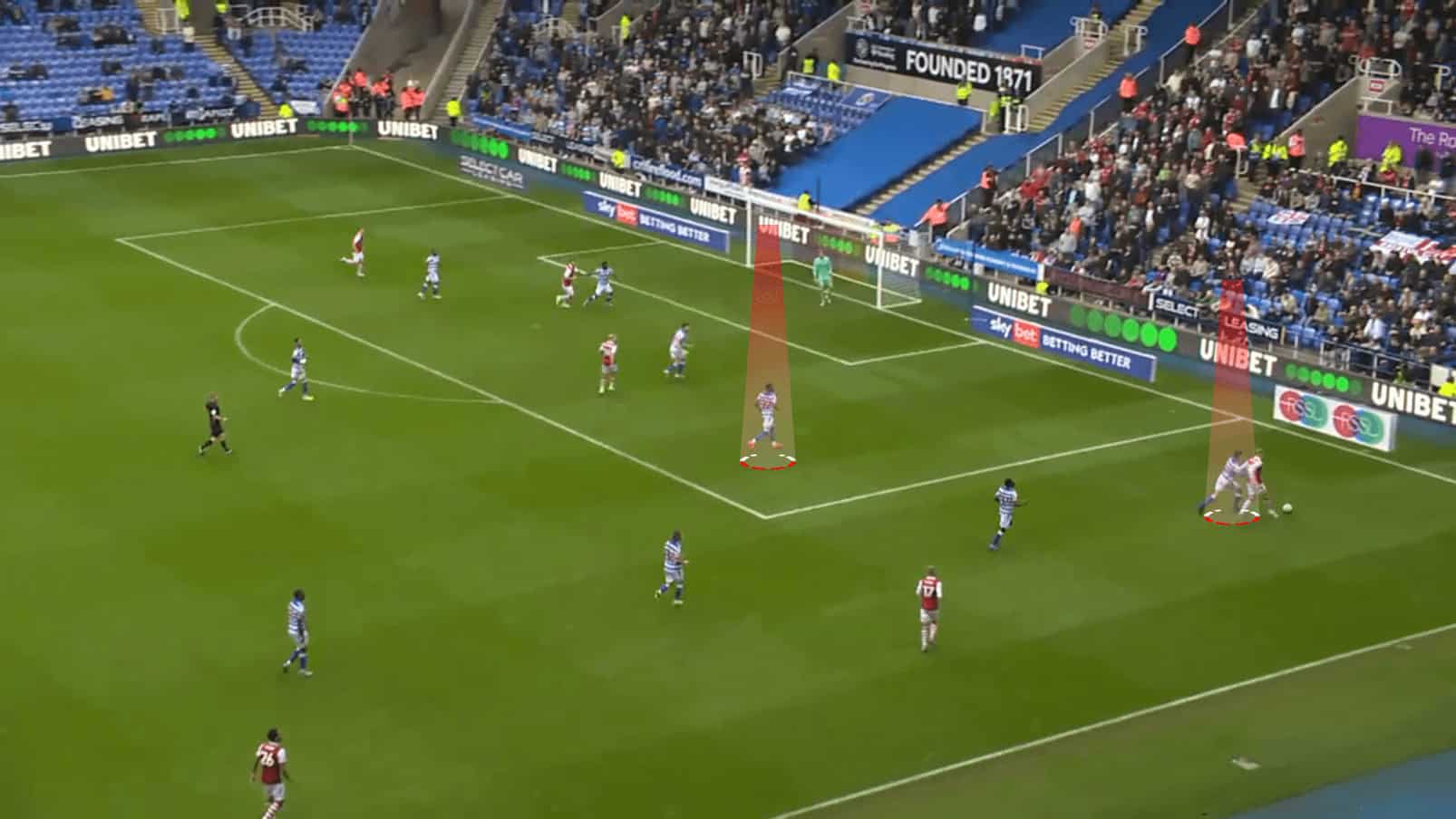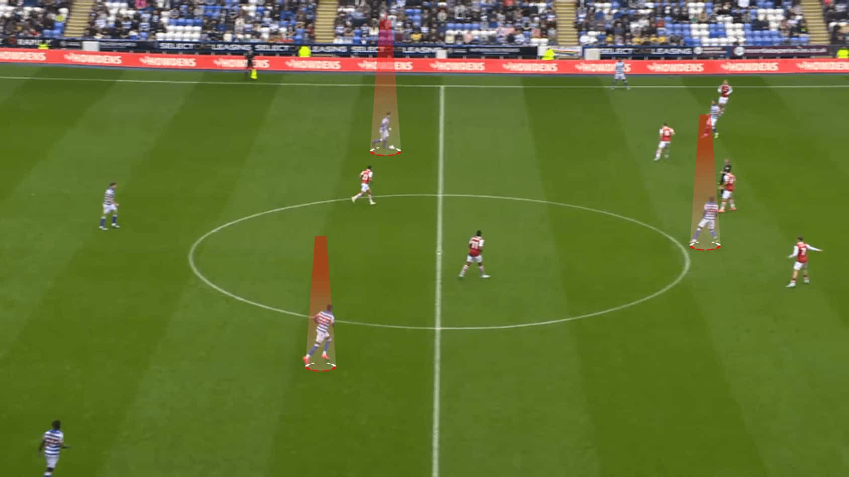 Reading likes to be a very pragmatic side that relies on a rigid and narrow low block, forcing rivals to get their 10 players to their own third, stressing them out because of not finding the right and progressive option between the lines but also having highly aggressive behaviours from their wing-backs to mark tight the opposition’s wide receivers. A low block couldn’t be rigid and solid if the roles aren’t as clear as they have been early into Reading’s campaign.