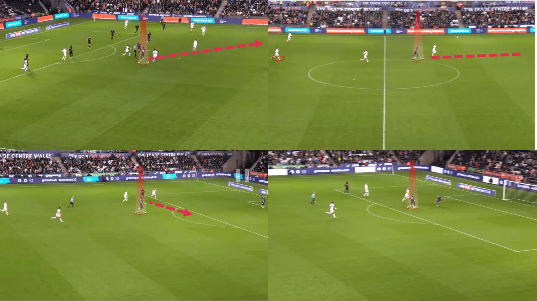 Once again, this situation was repeated, not in the exact same way, but with the same principles against Swansea City in their 2-3 defeat at home. Thomas Ince has come to the midfield to clear the ball, it was kicked out with a purpose. Swansea have all their players inside Reading’s own third, this allows Yakou Meité to make a run in a very lonely path where he finds Harry Darling to fight in a 1v1 duel. He wins the ball and Thomas Ince arrives with an incredible run to finish an incredibly well-taken attacking transition.