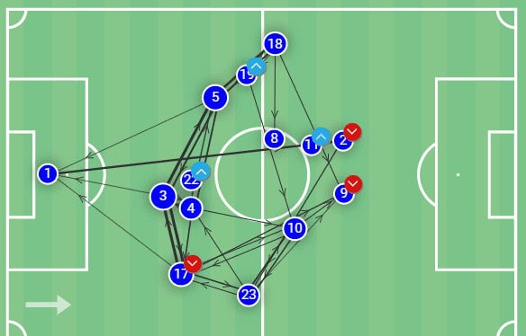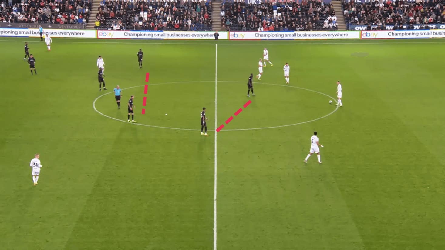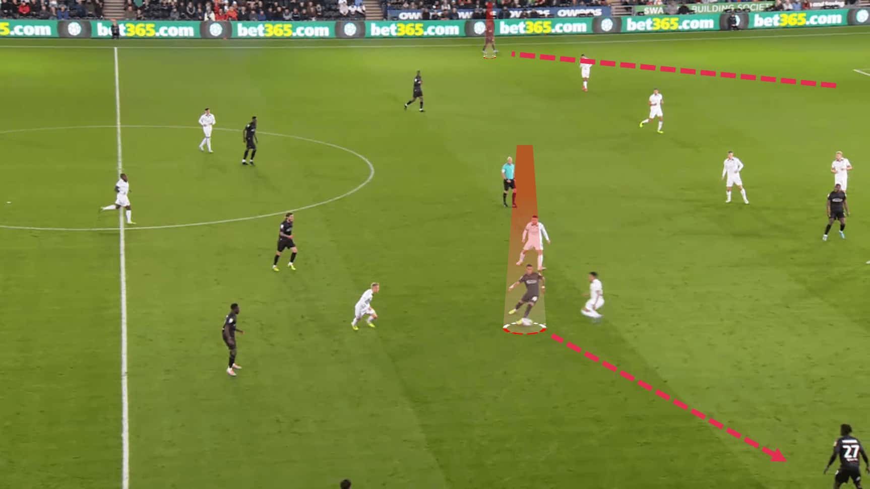 In this final example, we see the left-centre-back Tom McIntyre carrying the ball, where rotations had already happened here. Mamadou Loum pins as a pivot, giving the balance and most easy passing option in the central area. Lucas Joao has dropped out of his zone, Jeff Hendrick at his left has taken the half-spaces and Thomas Ince in a more advanced position that is not located in the image is taking Joao’s spot if a through pass is made between the lines so he can run to get 1v1 against the goalkeeper.