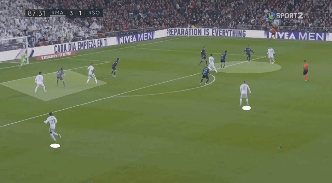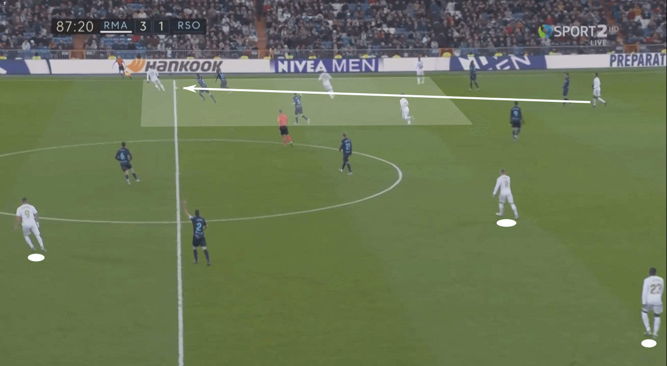 In the home La Liga leg against Real Sociedad, the trio of Bale, Benzema and Hazard showed excellent understanding of each other. One thing that was noticeable, and is quite common when Madrid attack, is that the four highest attackers pair off. Benzema will more frequently slide to the left half-space to link up with the left-forward, whereas the right-sided midfielder moves high into the right half-space to offer support for the right-forward. That played out in the example below, with Carvajal and Casemiro offering deeper support. As the side played out of the back, Varane split the defence, finding Bale high up the wing. Note the positioning of Isco, Carvajal and Casemiro between the two clusters of Sociedad defenders. Their position offers a line-breaking pass and commands the attention of the defenders behind them, who, in turn, lost track of Bale.