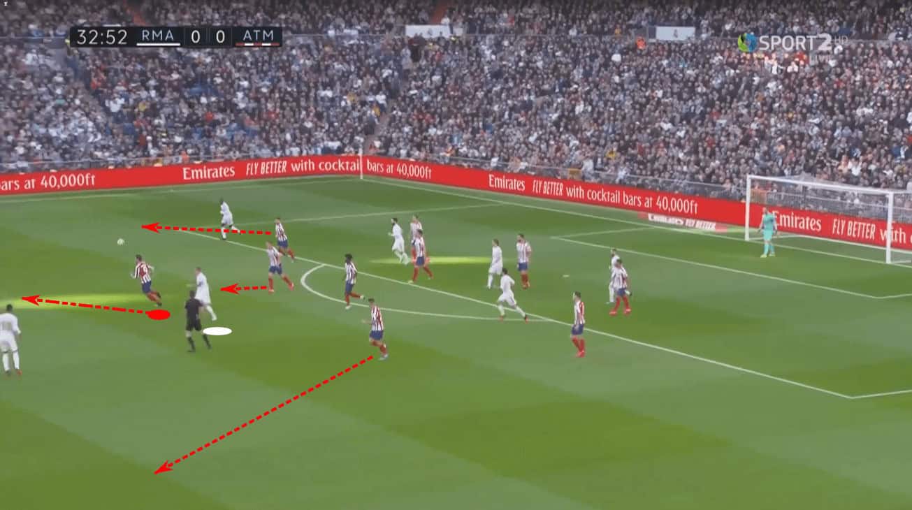 In the image below, Casemiro, Ramos and Varane are behind the ball and Kroos is in line with it. Those four are almost always behind the ball. A virtual square in the centre of the pitch eliminates penetration through the central channel. That forces the opponent wide, giving the rest of the team time to recover their ground. Atlético have just one player on their left-half of the pitch, but the run of Morata and recovery of Carvajal ensure he’s not a threat. Varane is also ready to unleash his rocket-propelled boots to cut out any passes over the top. Ultimately, this attack ended with Morata taking the ball out of bounds due to Ramos’ pressure.