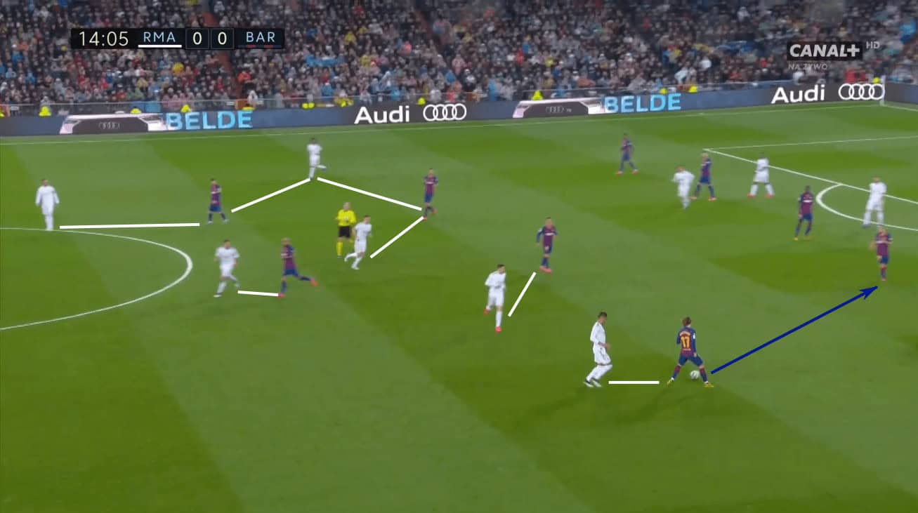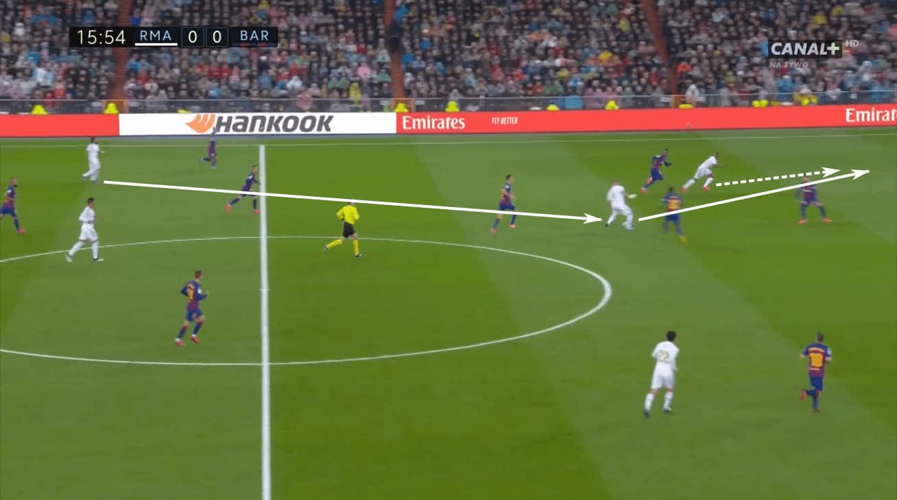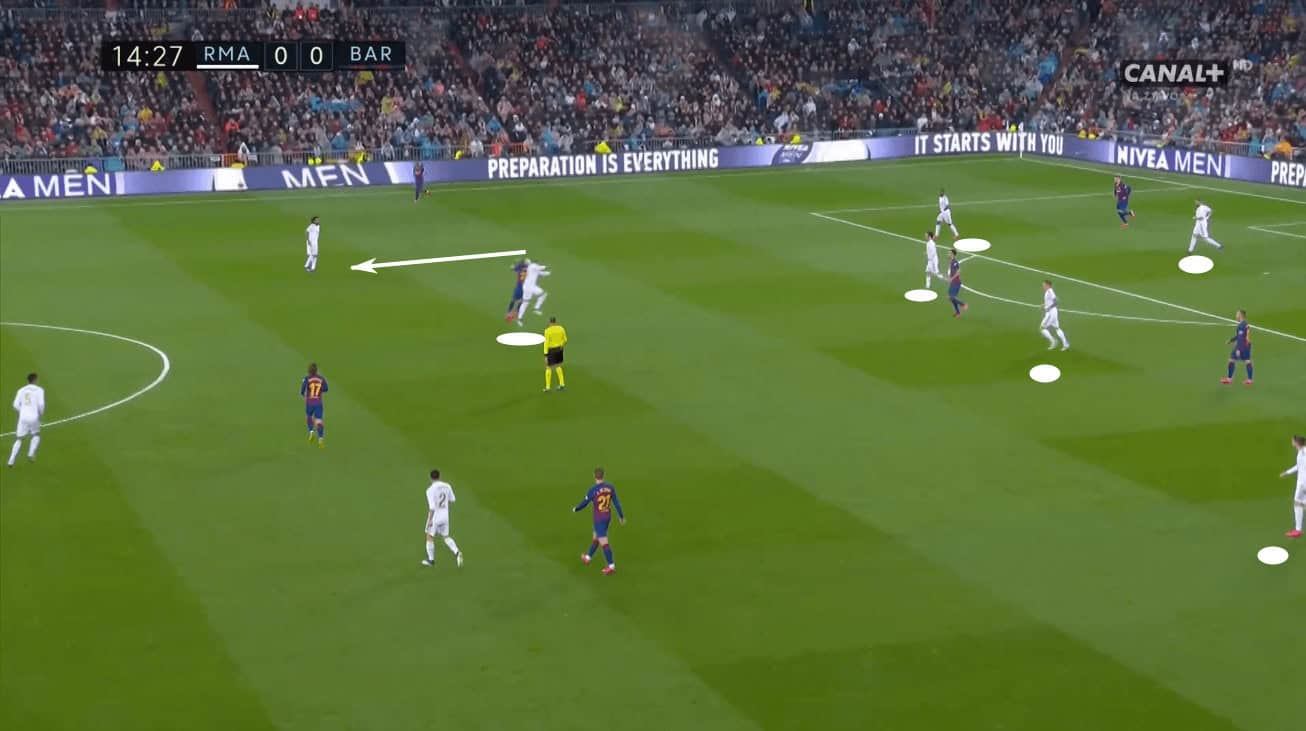 His delivery is won by Casemiro. The resulting header to Marcelo relaunched the Madrid attack, this time with Barcelona is a more expansive attacking shape.
