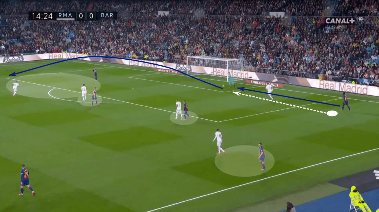 El Clásico offered a situation of this sort. Marcelo’s pass to Benzema was controlled by the Frenchman. Samuel Umtiti was man-marking at the time and chased him into the space just in front of Gérard Piqué. With the Spaniard holding a deep line, Vinícius Júnior had room to run behind the defence. Benzema played him through, but, with the undeveloped chemistry between the two, the run was a fraction of a second late and the pass was a bit too forceful. Vinícius Júnior did collect the ball, but well into the wing. Nélson Semedo caught his counterpart, putting in a strong tackle to kill the attack.