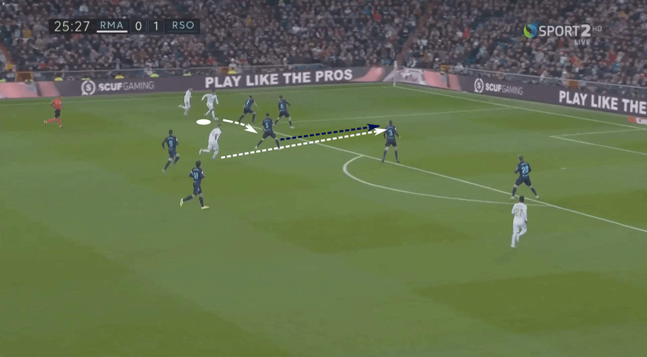 The chemistry of Hazard and Benzema was on display roughly 20 minutes later, this time through the dribble. Knowing that his teammate prefers to cut inside to shoot with his right foot, he understood that he needed to drag the holding midfielder, Igor Zubeldia, away from that space. Benzema made a decoy run, pulling the defender out of that space and allowing Hazard to cut inside and take a shot.
