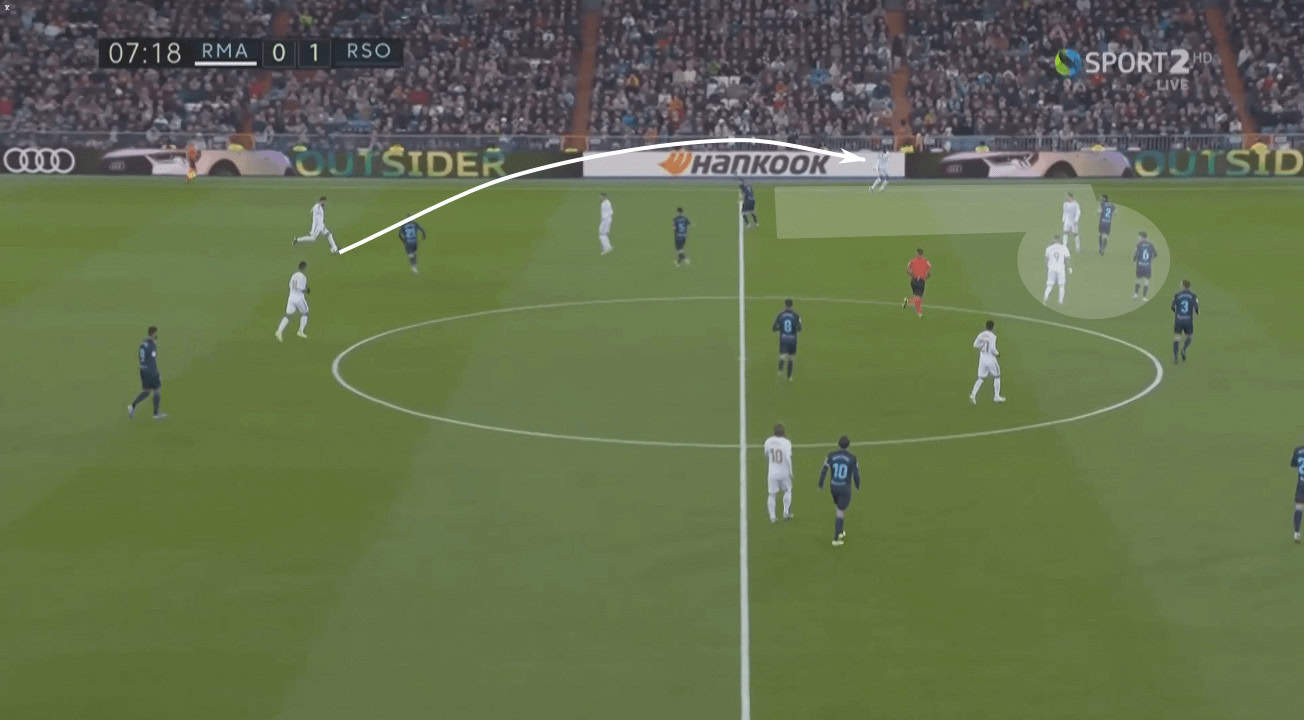 Below is another example from that Real Sociedad match. With Ramos on the ball, Hazard and Benzema occupied the left half-space, cueing Mendy to move into a high and wide position. Ramos’ chip finds him, initiating an attack on the right side of Sociedad’s defence.