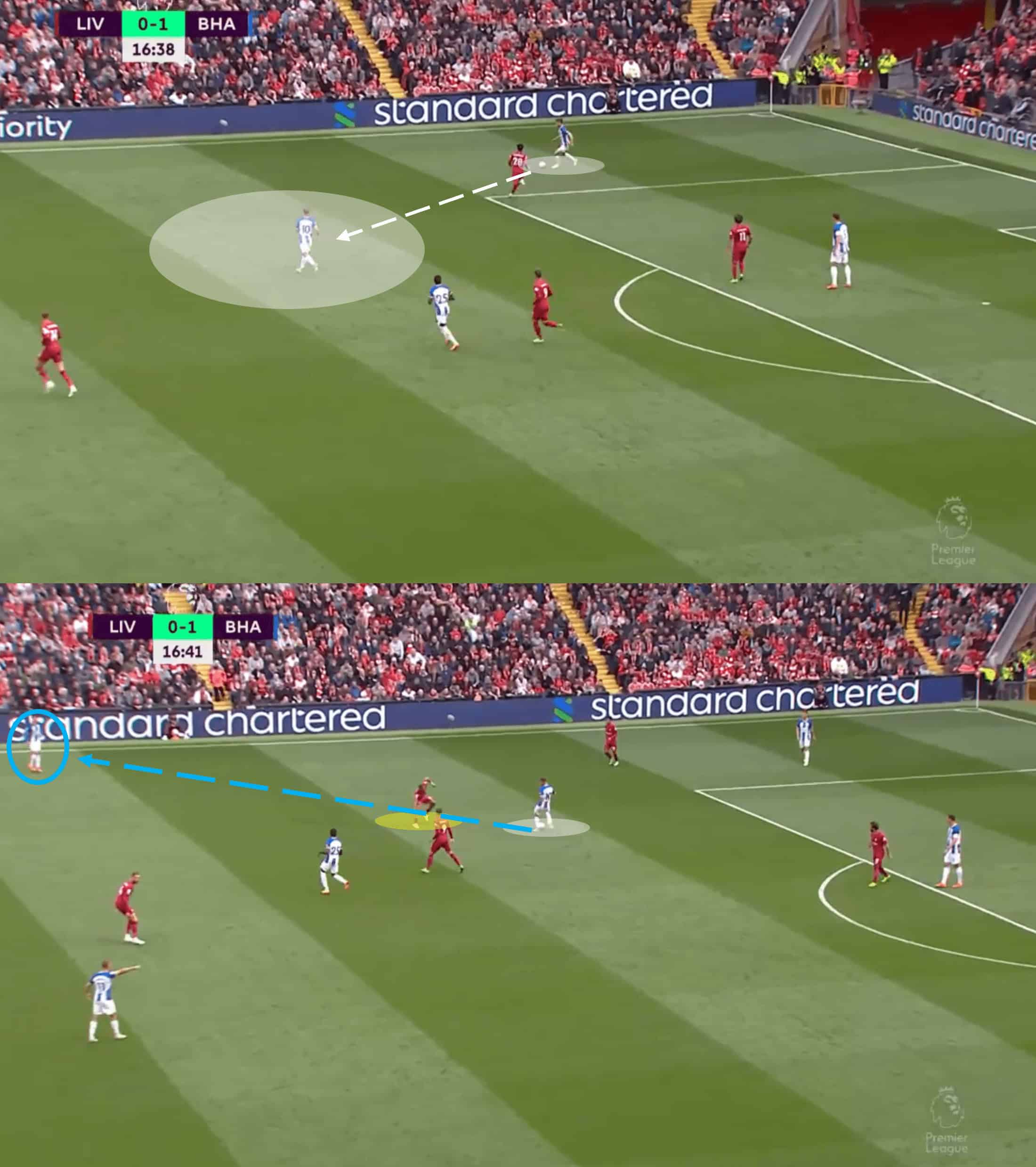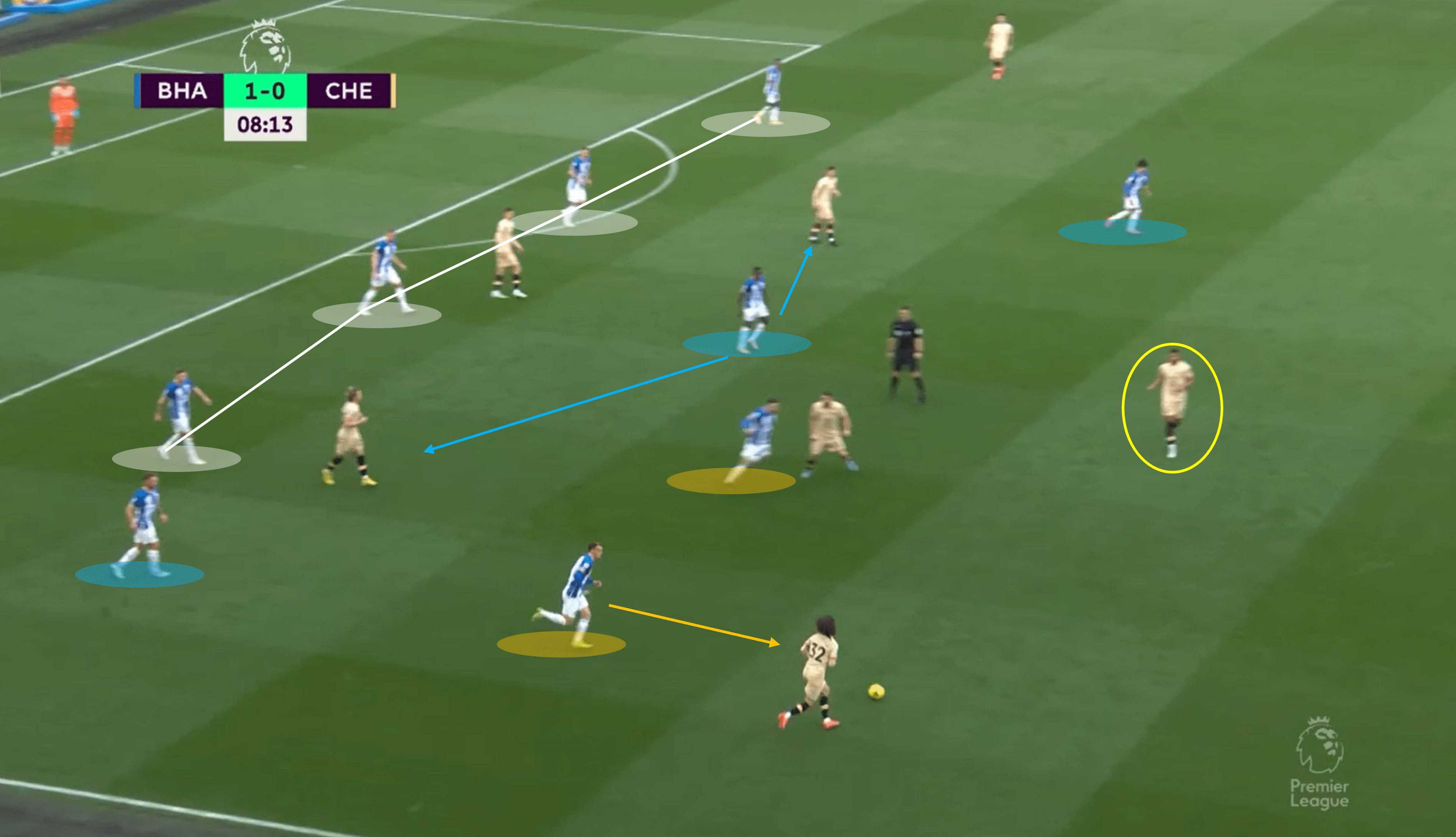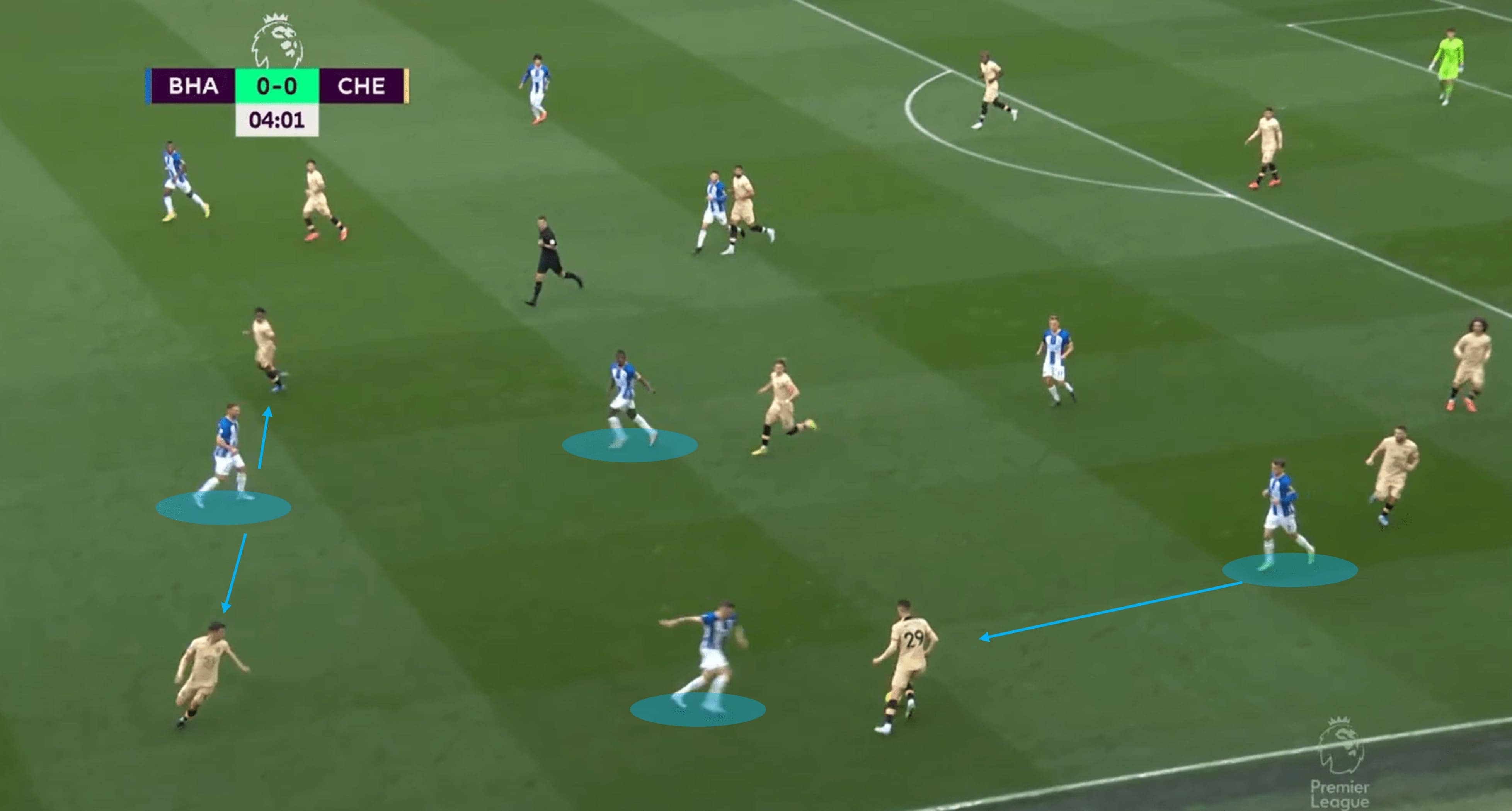 We could go through the number of positional re-shuffles Brighton could have undergone to adjust to the situation accordingly, because there are many options. Instead, we focus on the outcome of the Seagull’s failed isolated press. For a start, Kovačić is running at them at speed in their own half.