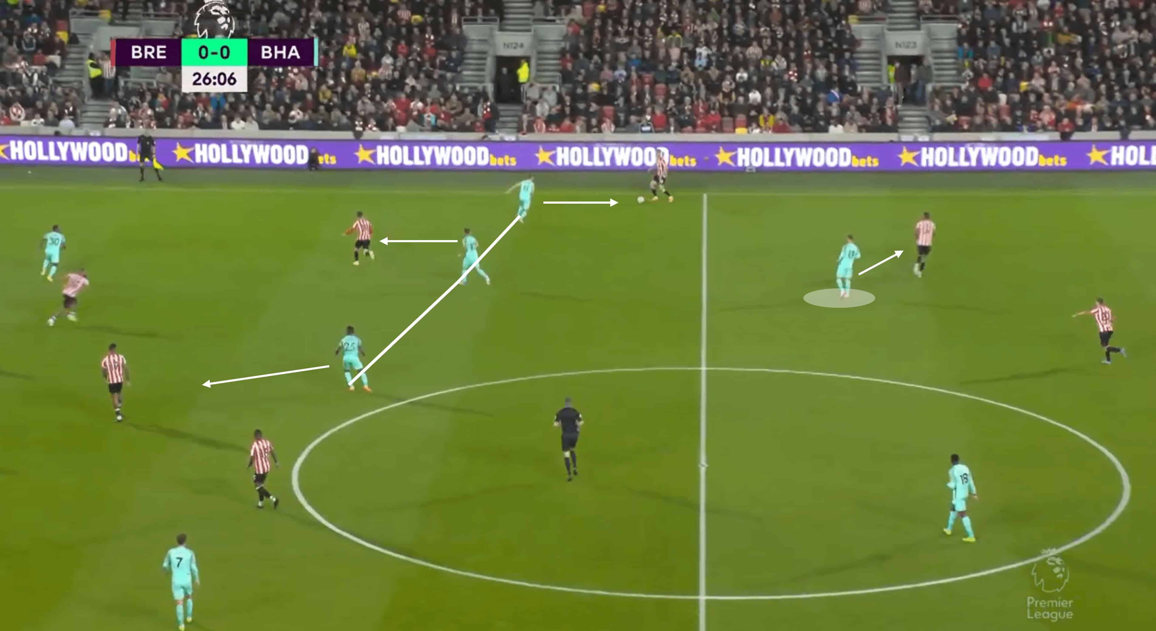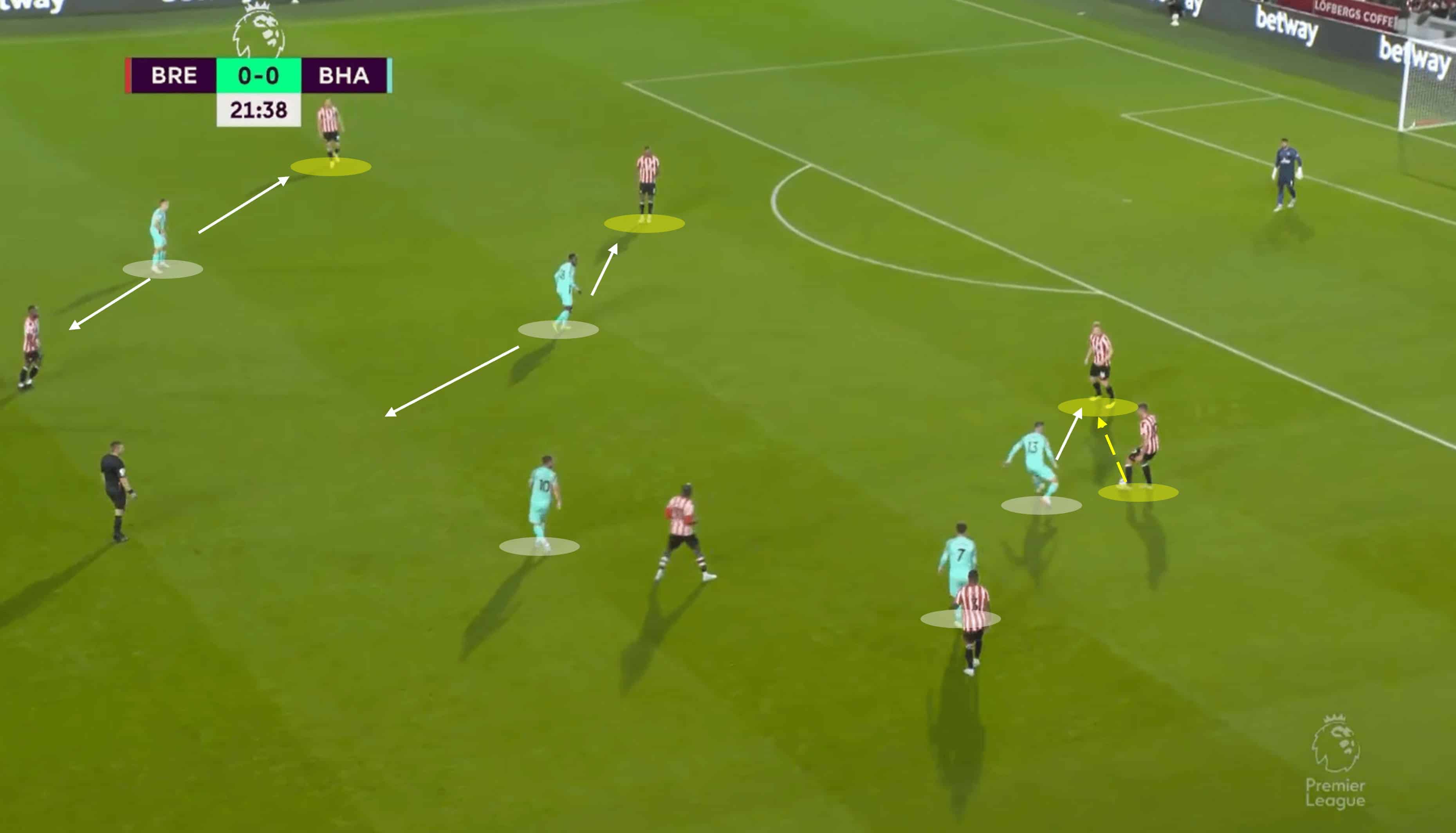 Back to the positives now, with an example of a good press from Brighton. With Brentford playing on their heels slightly and being hesitant on the ball, Brighton’s set-up says it all – they smell blood. Five players in the shot – that’s five players high up the pitch after 20 minutes away at Brentford with the score 0-0, highlighting just what de Zerbi is all about.