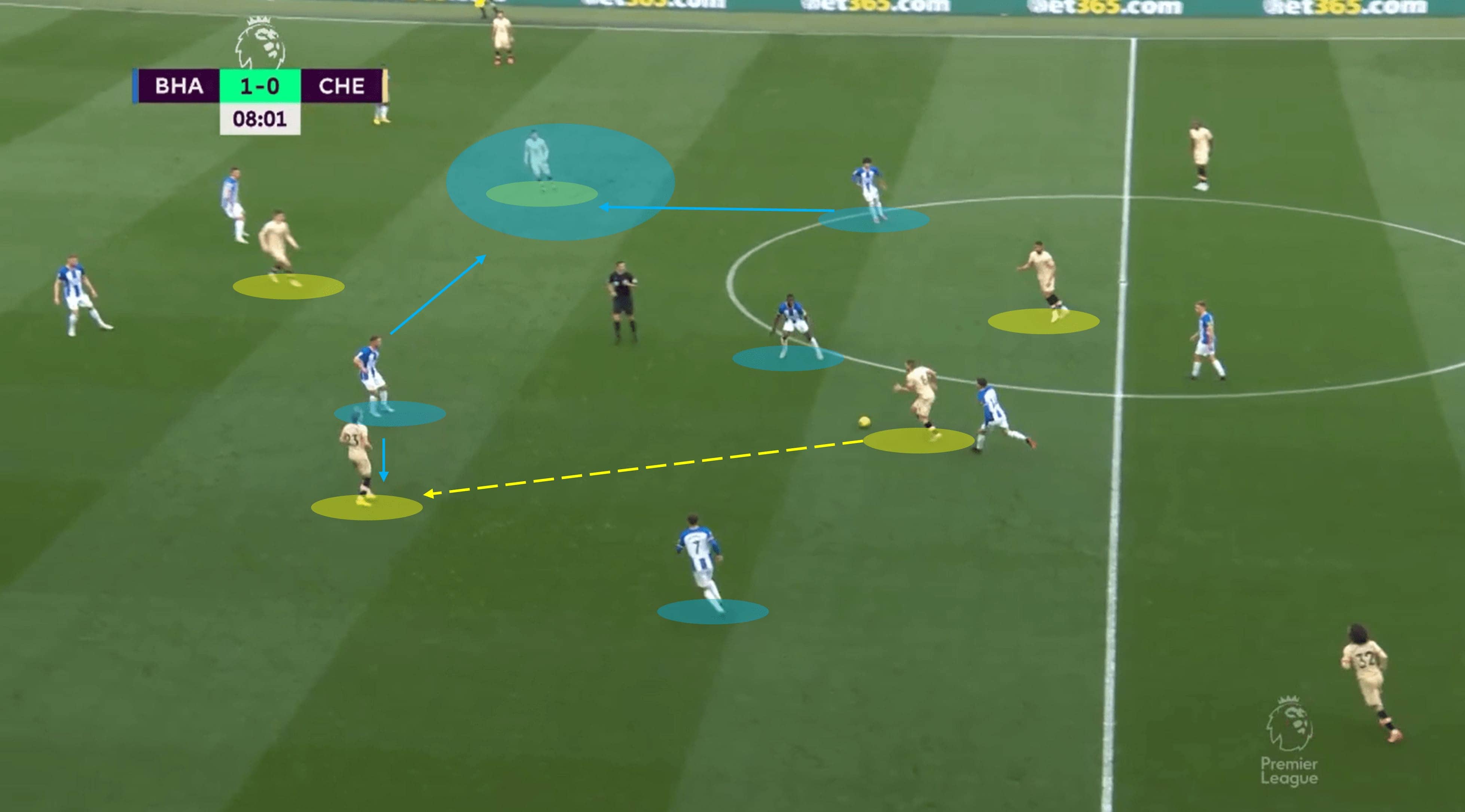 As we can see from the first image above, Brighton are not afraid to play out from the back but do so with the required urgent energy. In this case, Chelsea already had some numbers high up the pitch, which actually suited Brighton even more.