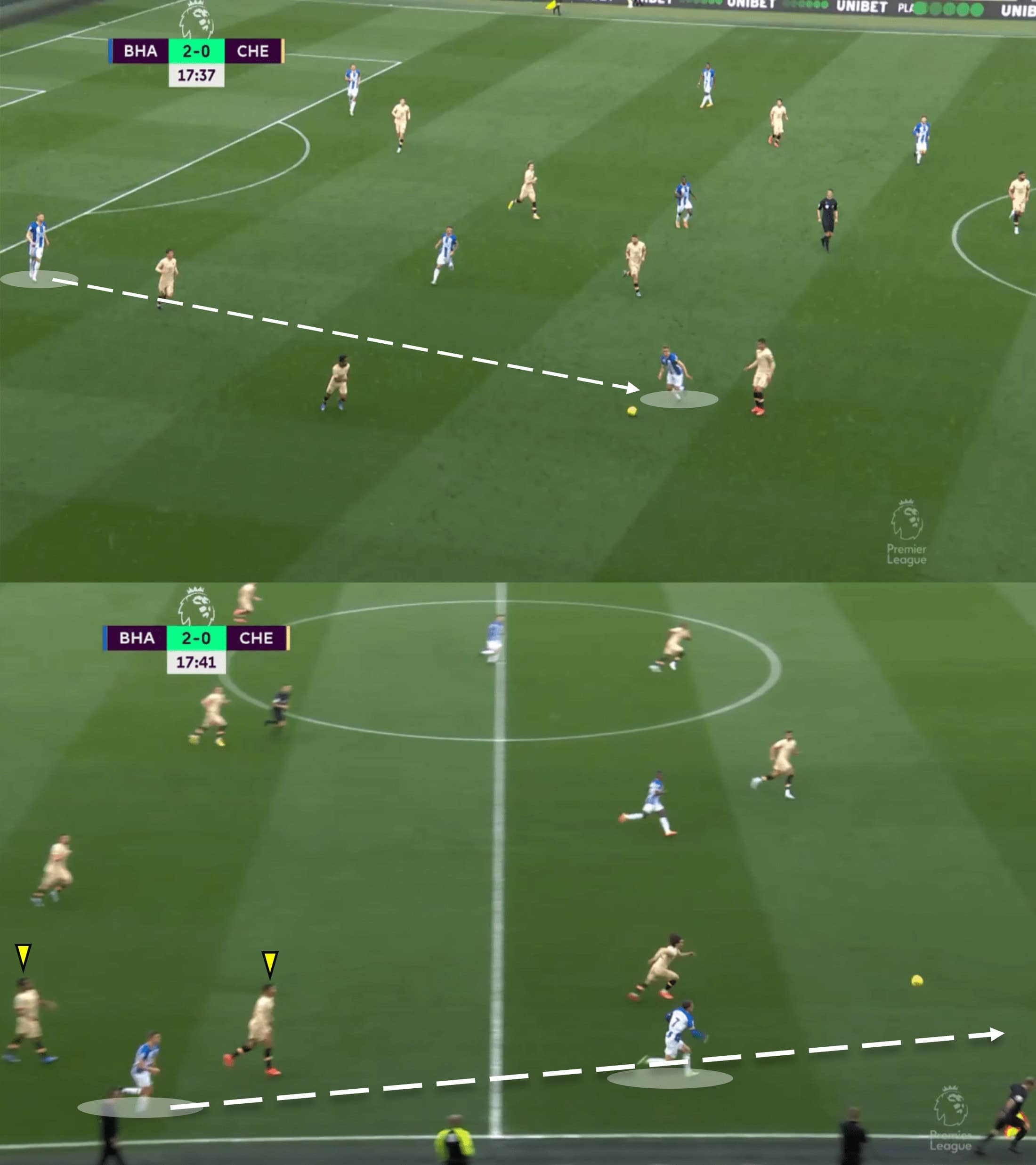 In the two images above, straight away you will notice the difference in space that Brighton have, as well as the number of Chelsea players close by. They look to use both of these to their advantage, quickly gaining distance up the pitch.