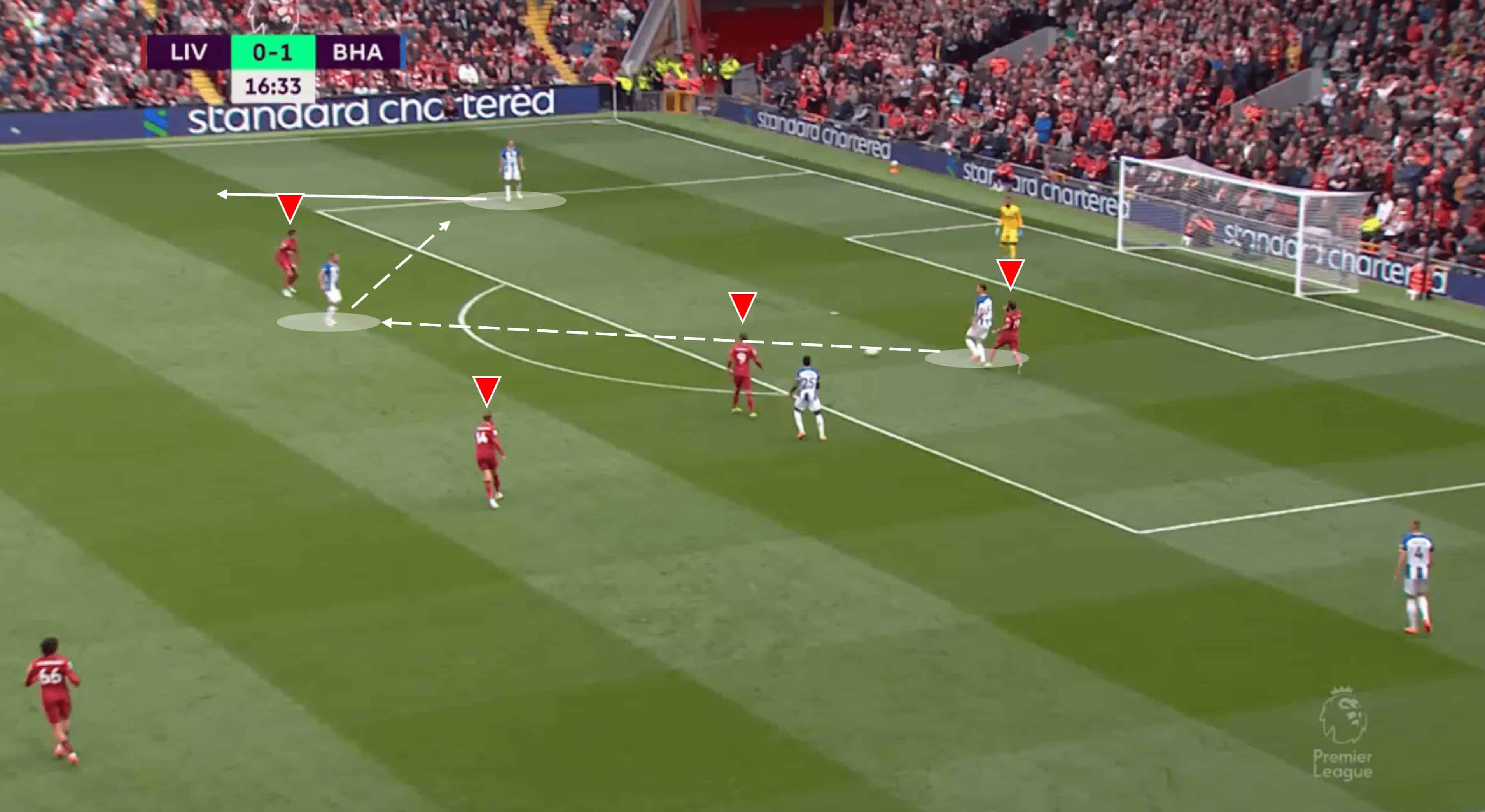 Brighton’s confidence already took a boost thanks to Trossard’s first of three goals on the afternoon, giving them an early lead in Merseyside. And while his second goal came after some direct play and fortune, the passage of play started with some classy possession play, beating Liverpool’s press along the way.