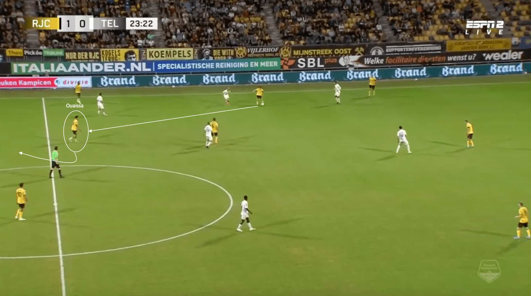 The run from Peña Zauner creates an overload against the Telstar defender, with the Venezuelan being on the goal side of the defender. The run drags the defender out, allowing Ould-Chikh to get a shot off on target. Though the goalkeeper saved the shot, this goalscoring chance resulted in higher up the pitch, starting with the clever movement of Ouaissa to find the pocket of space in Telstar’s midfield.