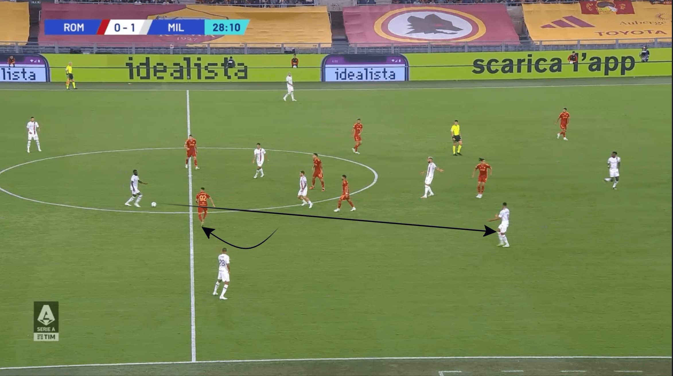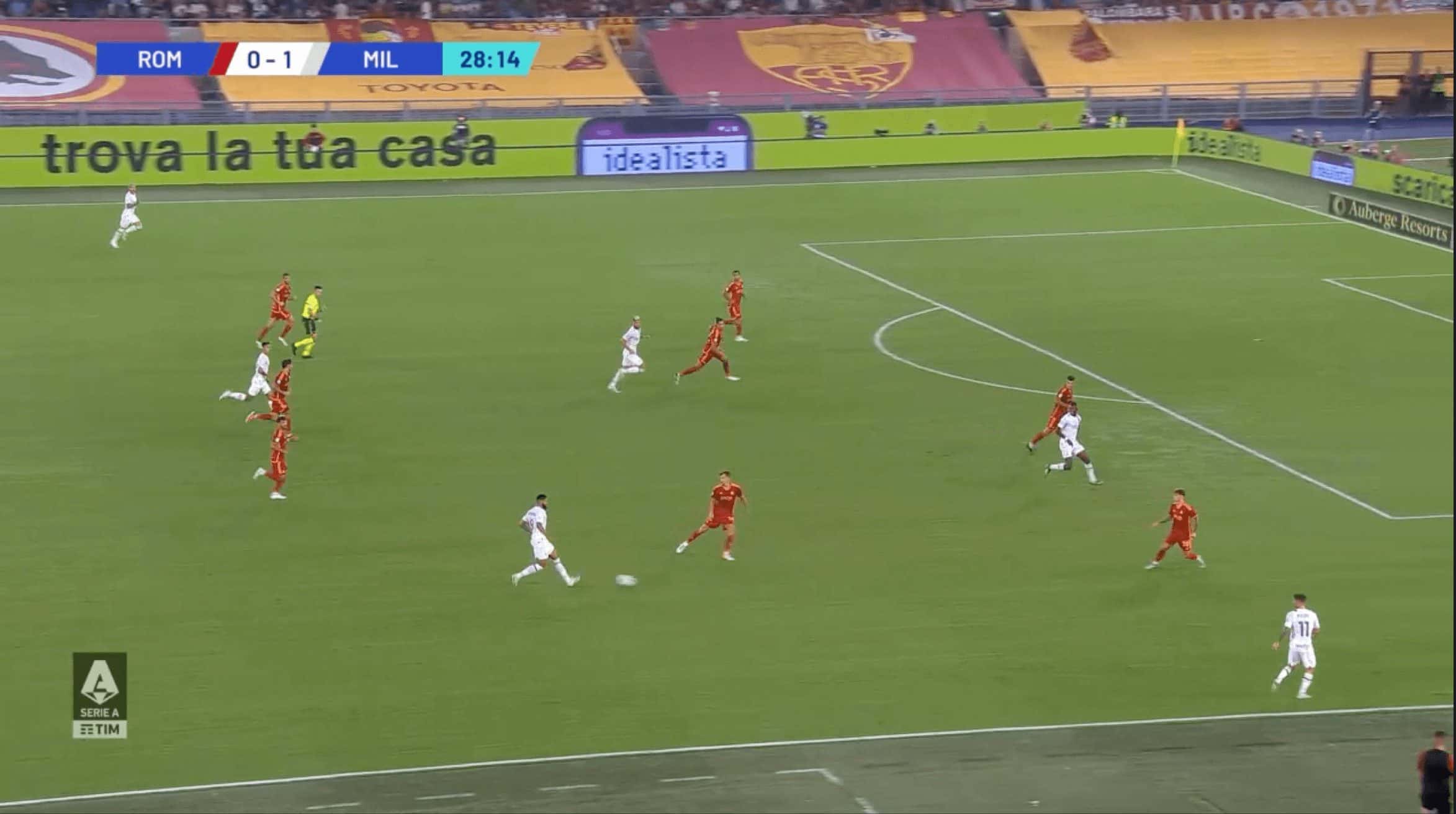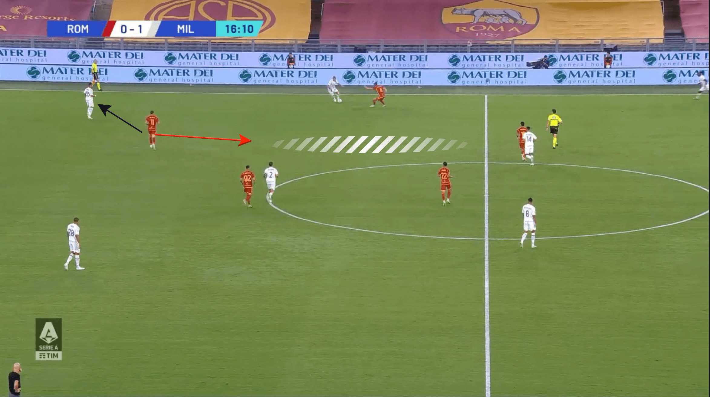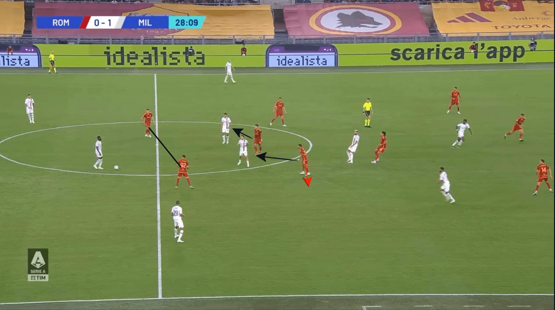 The general positioning of their forwards was a notable issue in the game against AC Milan. In this particular game, Roma were up against a Milan side that looks to create central overloads. Roma’s strikers would continually adjust their positions in order to cover players in the backline even when the ball had progressed further up the pitch. This resulted in Roma being unable to mitigate the threat of Milan’s midfield overload adequately.