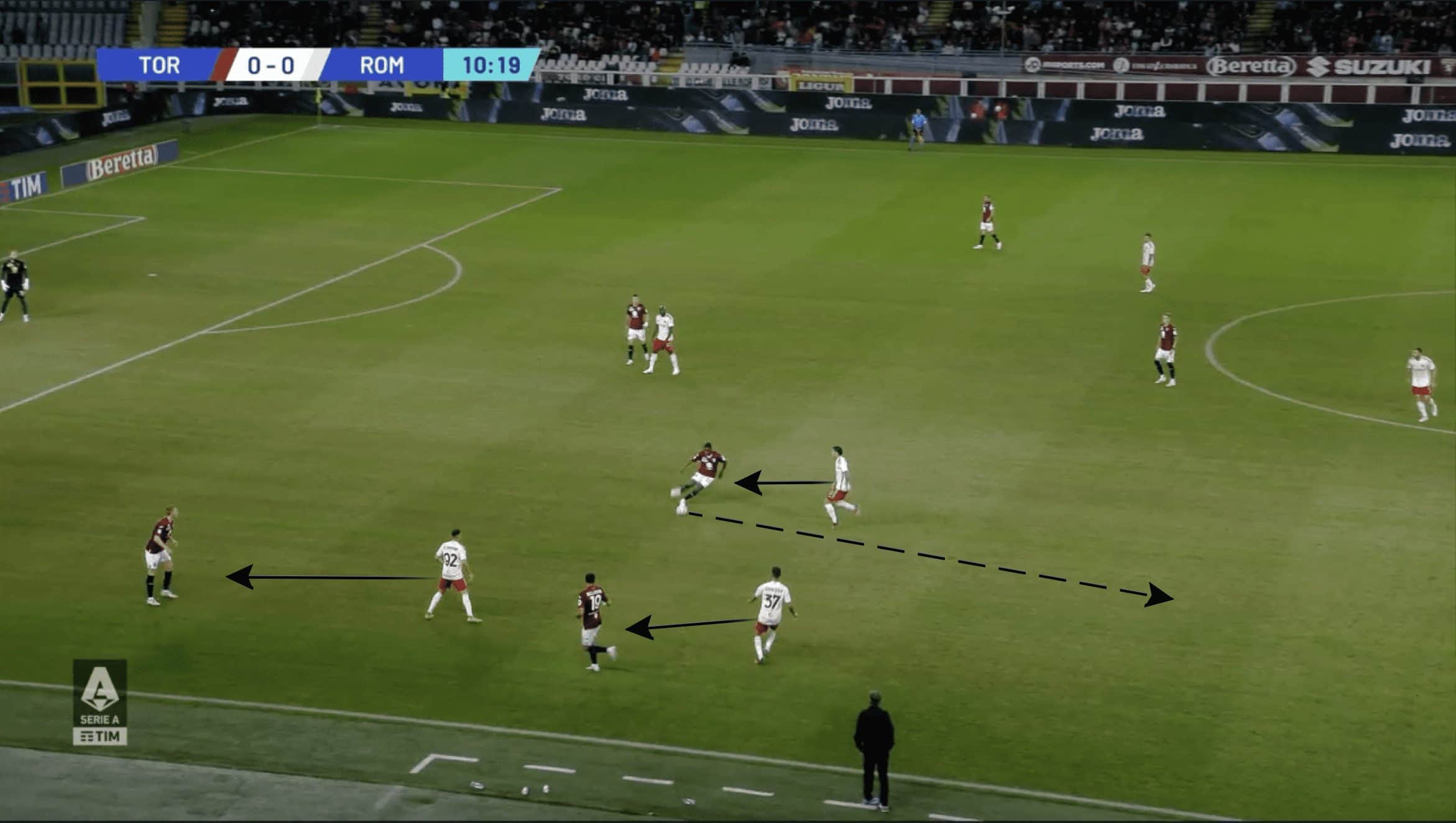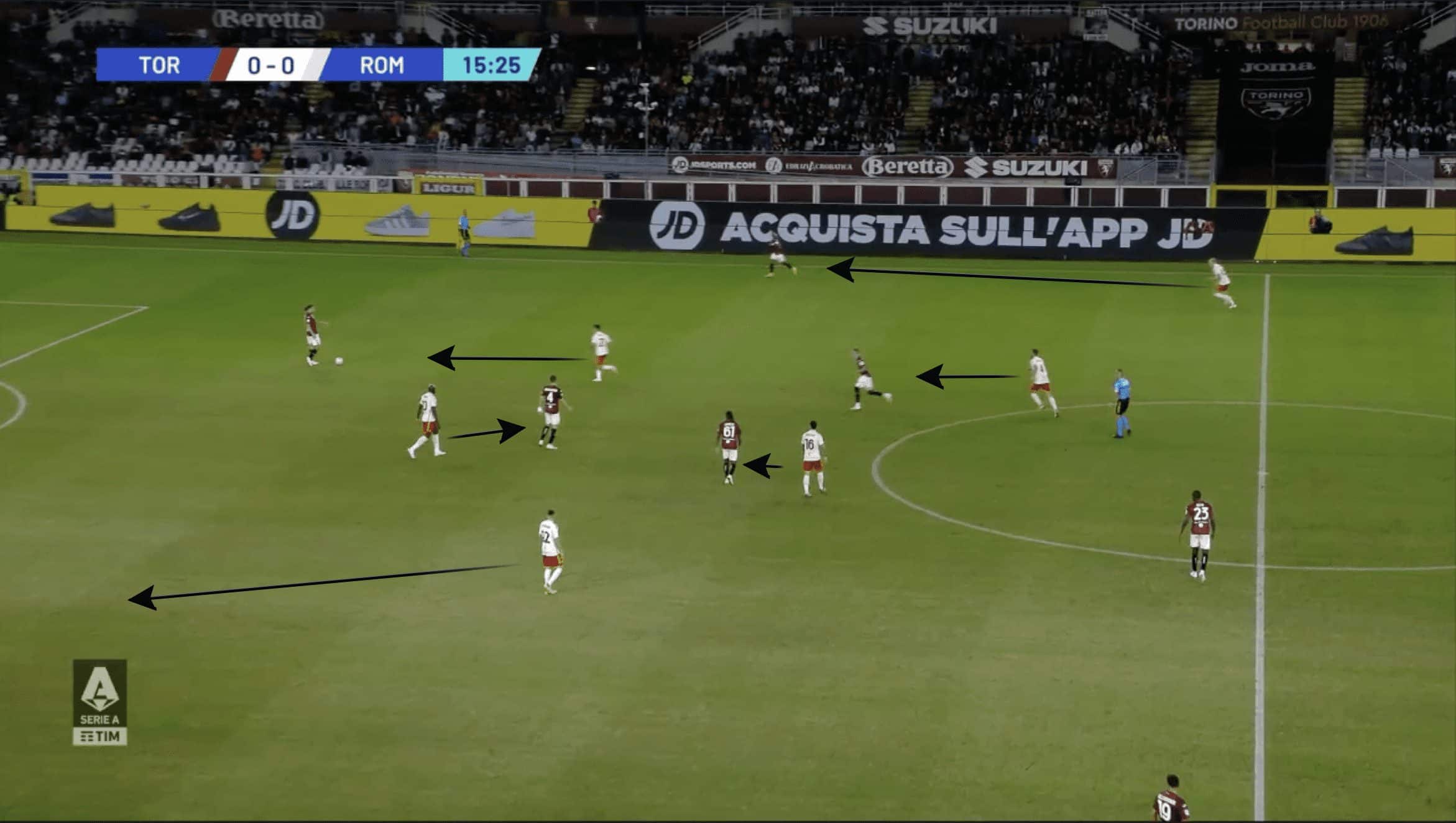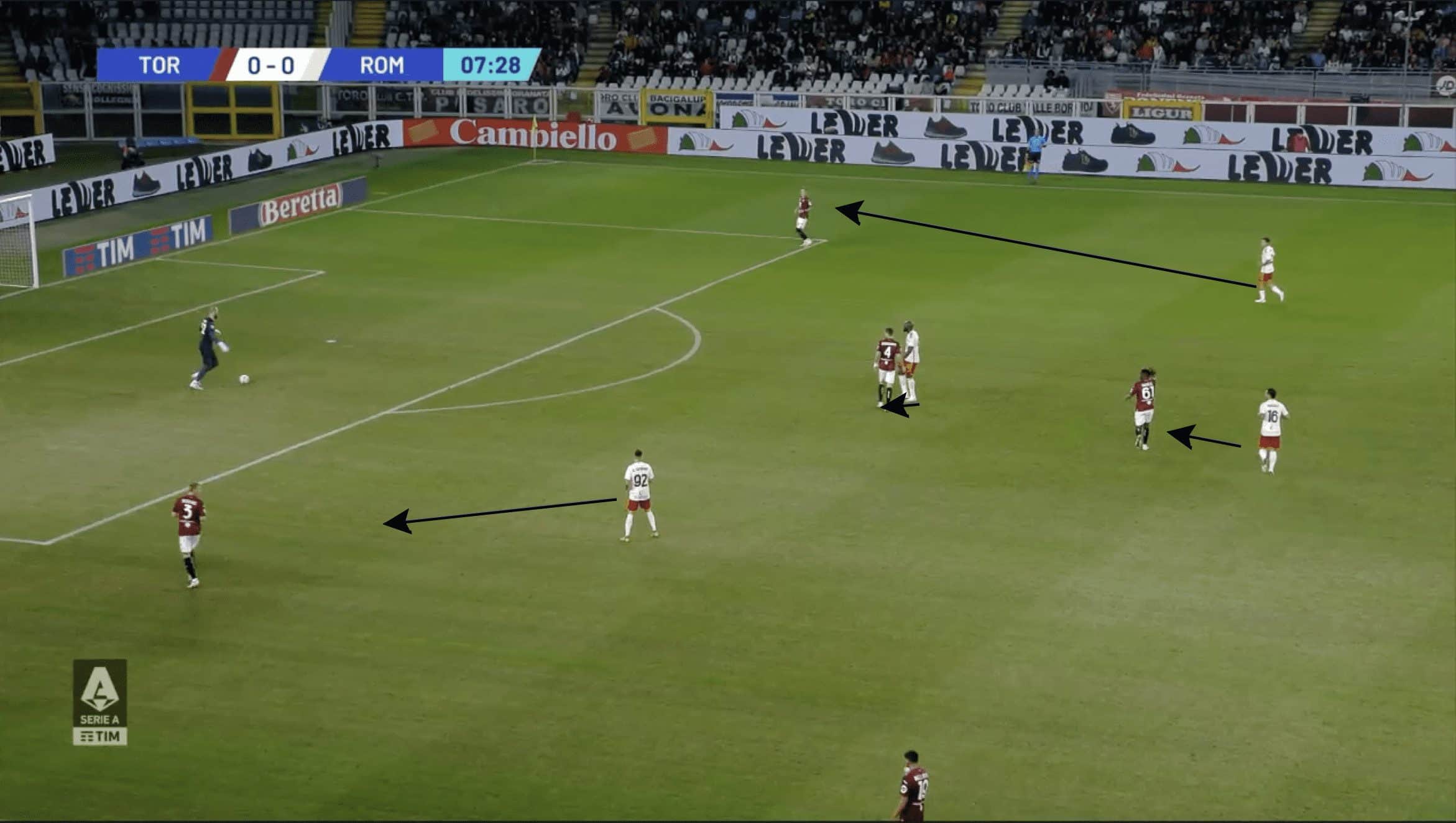 As a result, Leandro Paredes and Houssem Aouar are forced to cover the two opposing players in this area of the pitch, which restricts their ability to cover the space around them and creates more space for the opposition to progress the ball. Roma’s positioning disadvantages them even when they have a 4v3 advantage on the ball.
