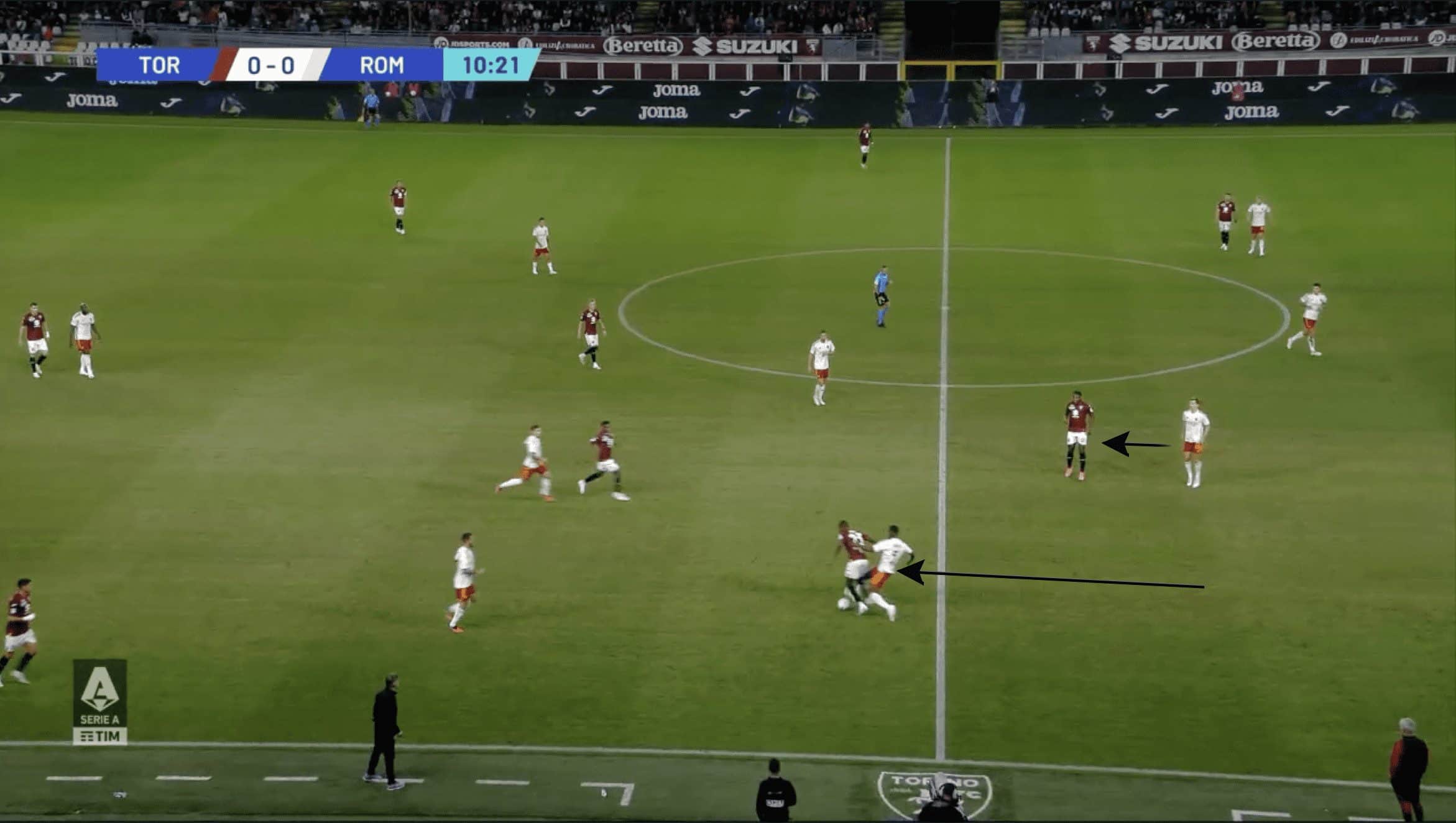 This can be seen in the image below, with Roma defending further up the pitch. In this scenario, Lorenzo Pellegrini covers the opposition midfielder, with the two strikers on the edge of the box.