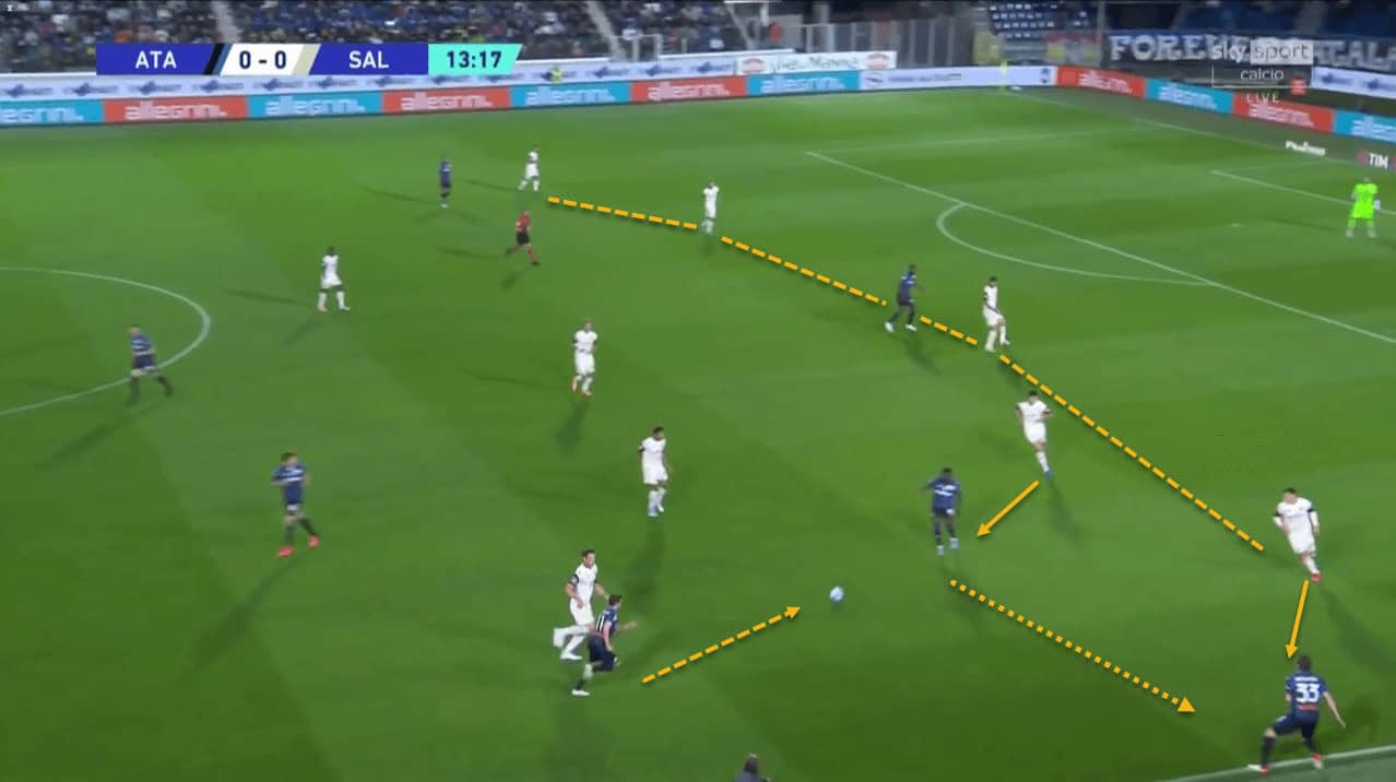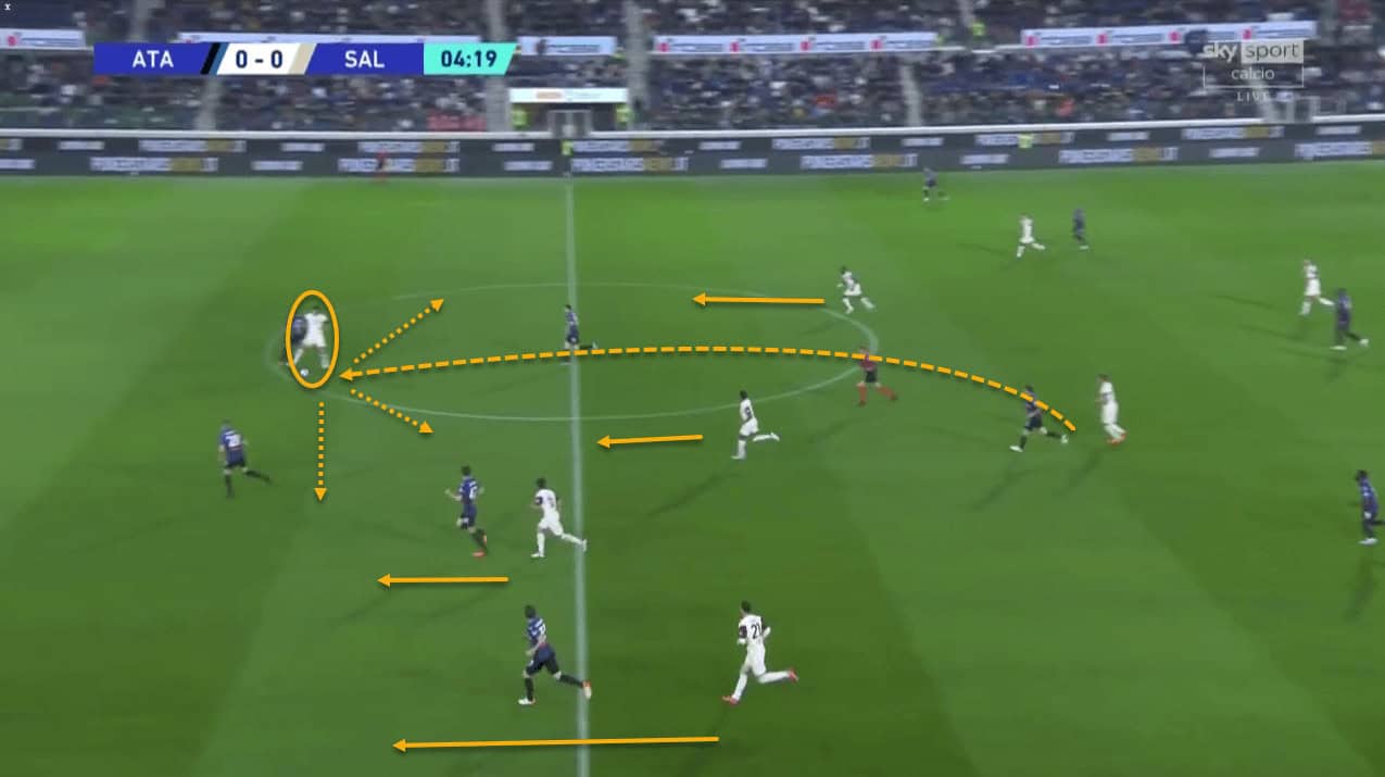 Salernitana are effective at getting players around Duric with this type of attack and then breaking into the space created in the opposition’s attacking third.