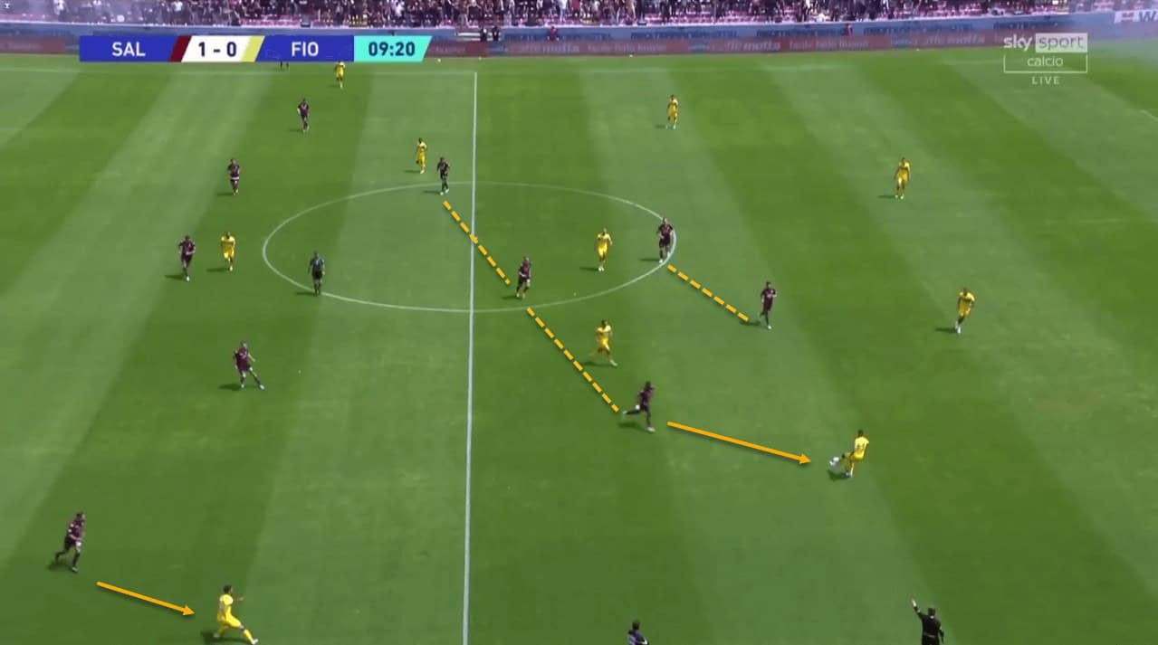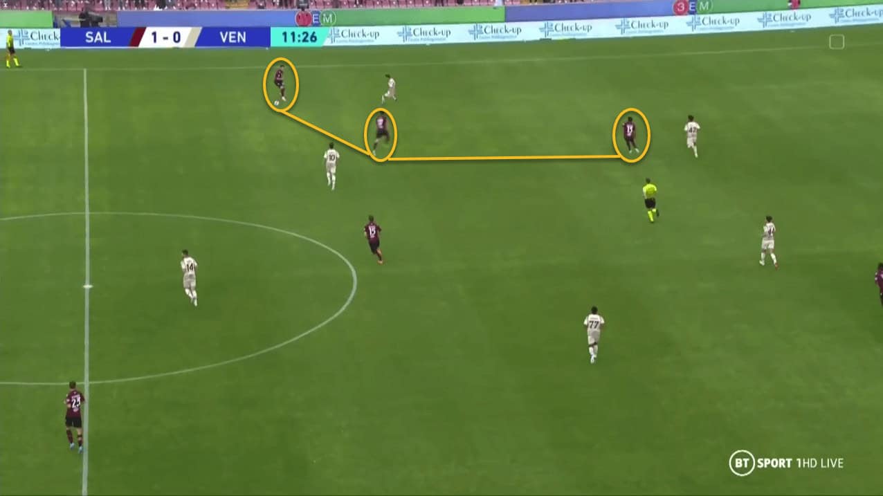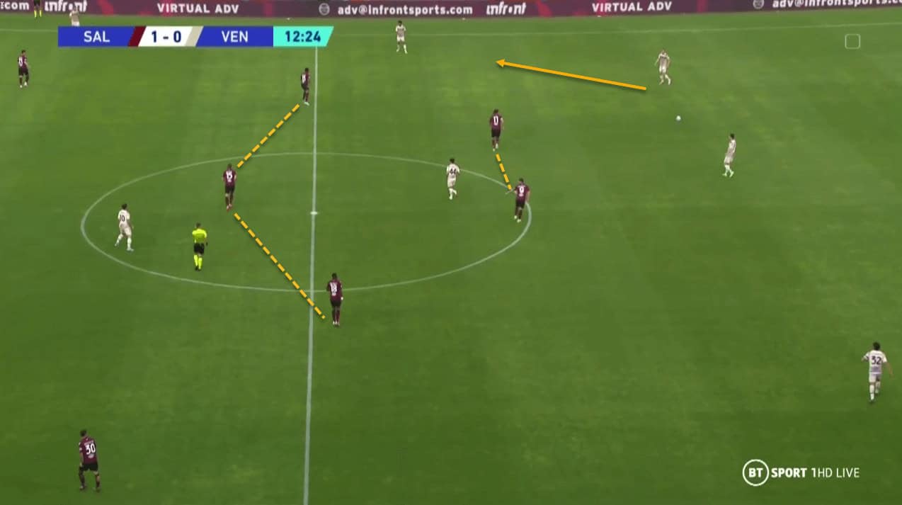 Building up through the wide areas allows Salernitana to protect the centre of the pitch if they lose possession out wide. In this setup, Salernitana have two centre midfielders that remain central which stops them from becoming vulnerable to quick transitions from the opposition.