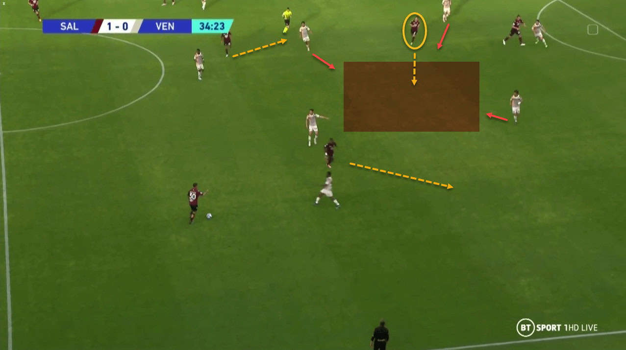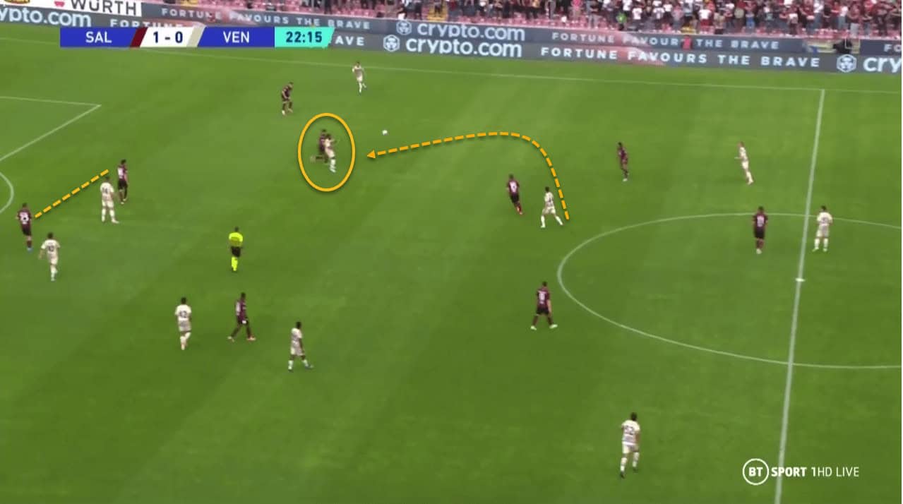 Look at the space that Federico Bonazzoli moves into here. He mas moved between the Venezia defence and midfield and could potentially occupy three of their players as he moves into the space highlighted. Even if he does not receive the pass, it disrupts Venezia’s shape.