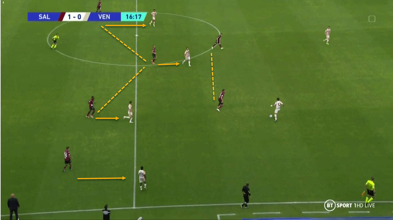 You can see the shape remains with five players. Neither of the centre forwards breaks the shape by going to press the man in possession. Unless the ball is being carried into the middle third then Salernitana will keep their shape.