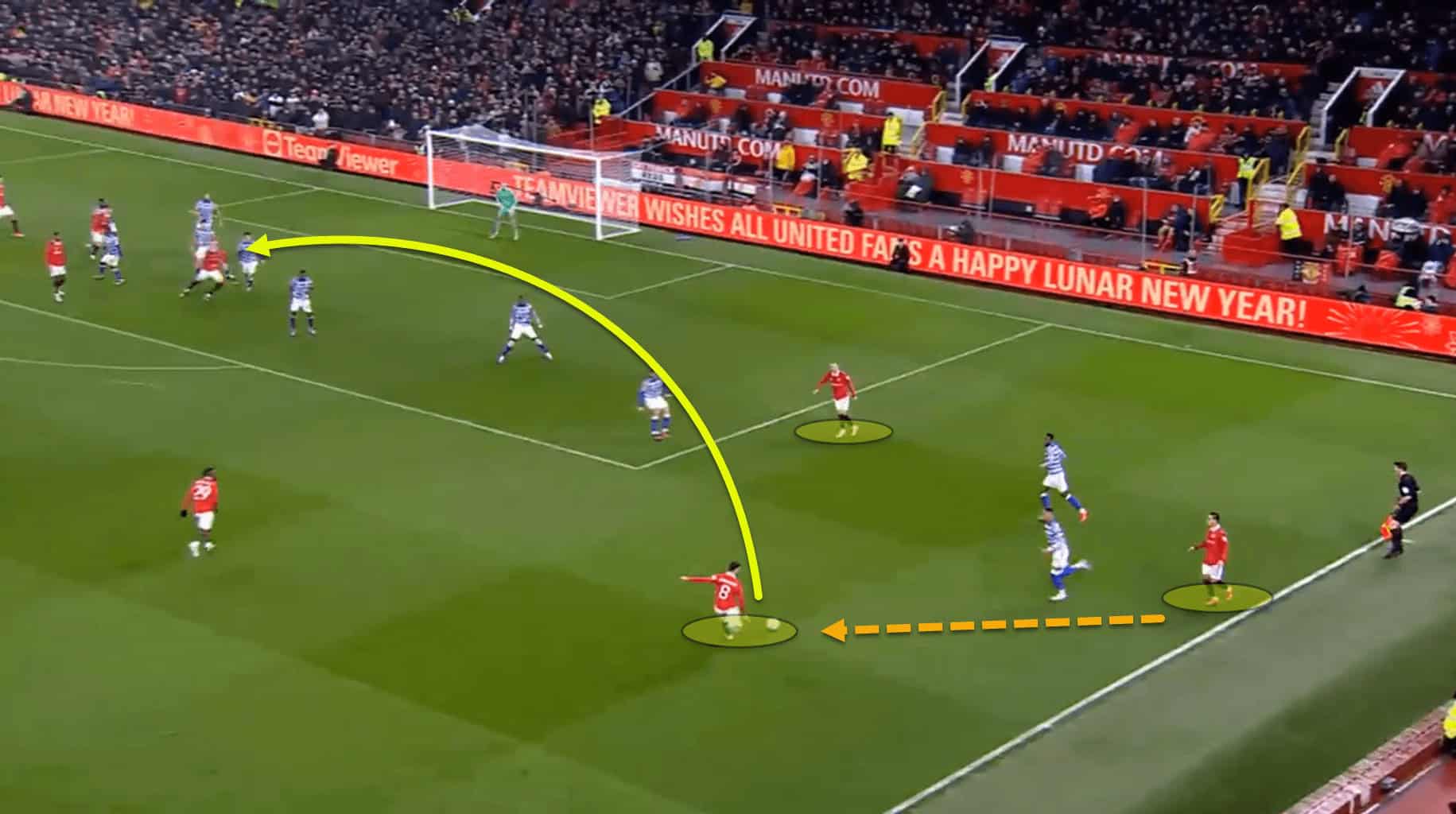 For instance, here, one player made a run deep in the halfspace to pin the opposition’s backline deeper. Bruno Fernandes noticed the space opening up and so moved there to receive from Antony before playing a first-time ball into the box.