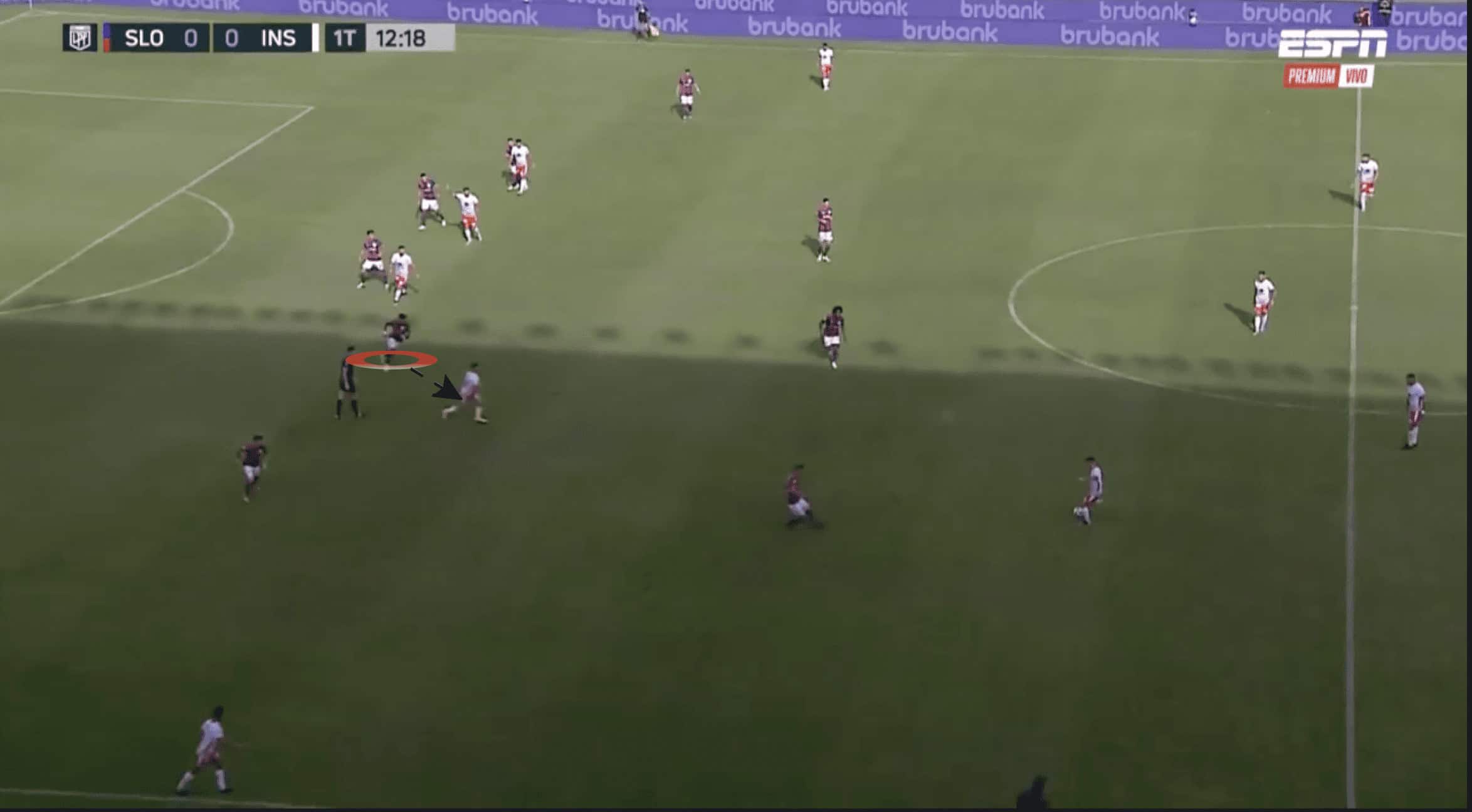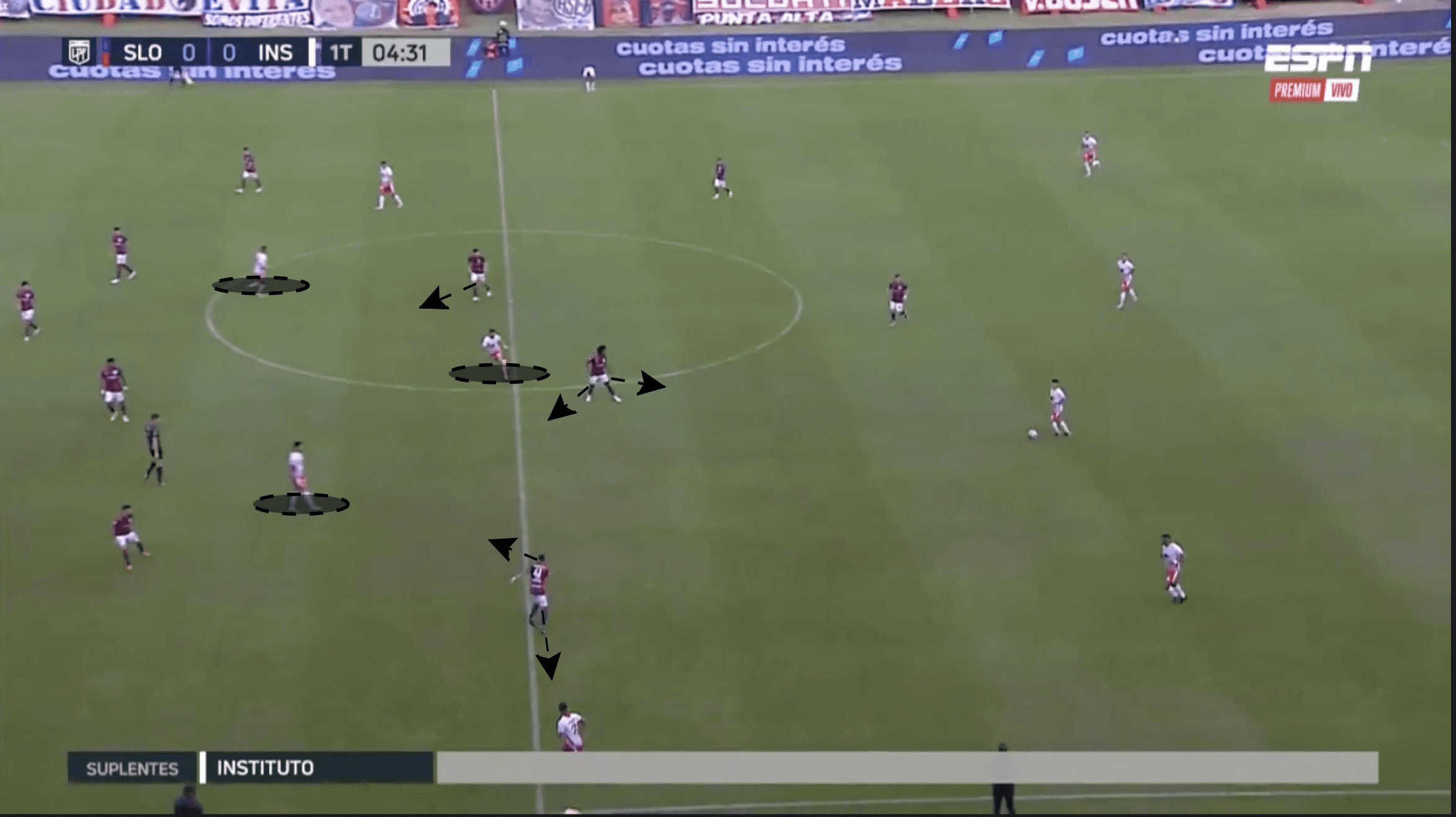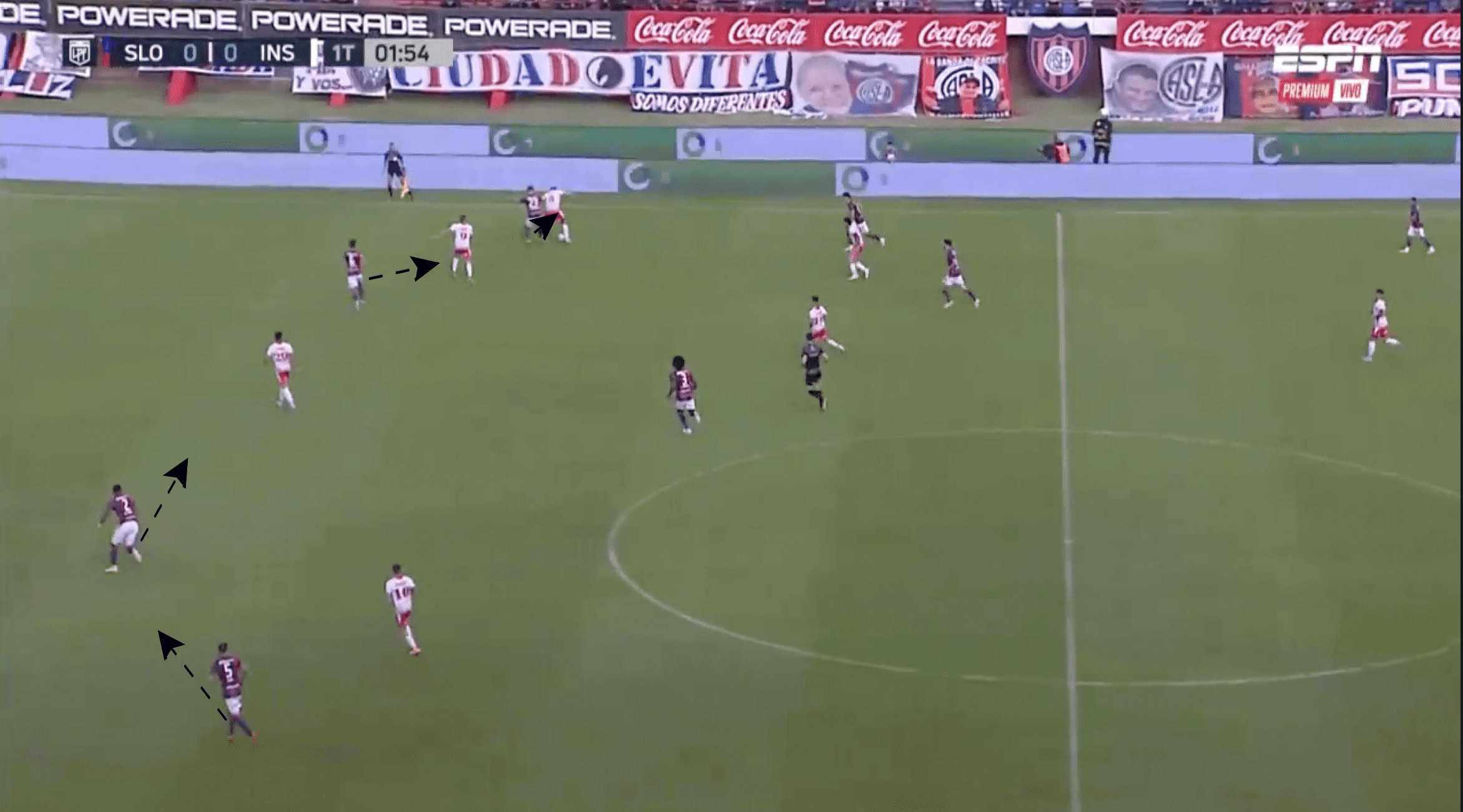 As previously stated, one of the most important elements in defending is adapting to the most dangerous risks posed by the opposition at a given time. This is something that the second line of San Lorenzo’s defensive line does very well. The double pivot of Augústin Martegani, the former Premier League and La Liga midfielder Carlos Sánchez and the wingers initially orient their positions to the opposition midfielders in their vicinity. However, an aspect that Ruben Insúa appears to have worked on with his side on the training ground, is assessing whether the opposition player they have oriented their position towards is the most significant risk to the team at that given point in time.