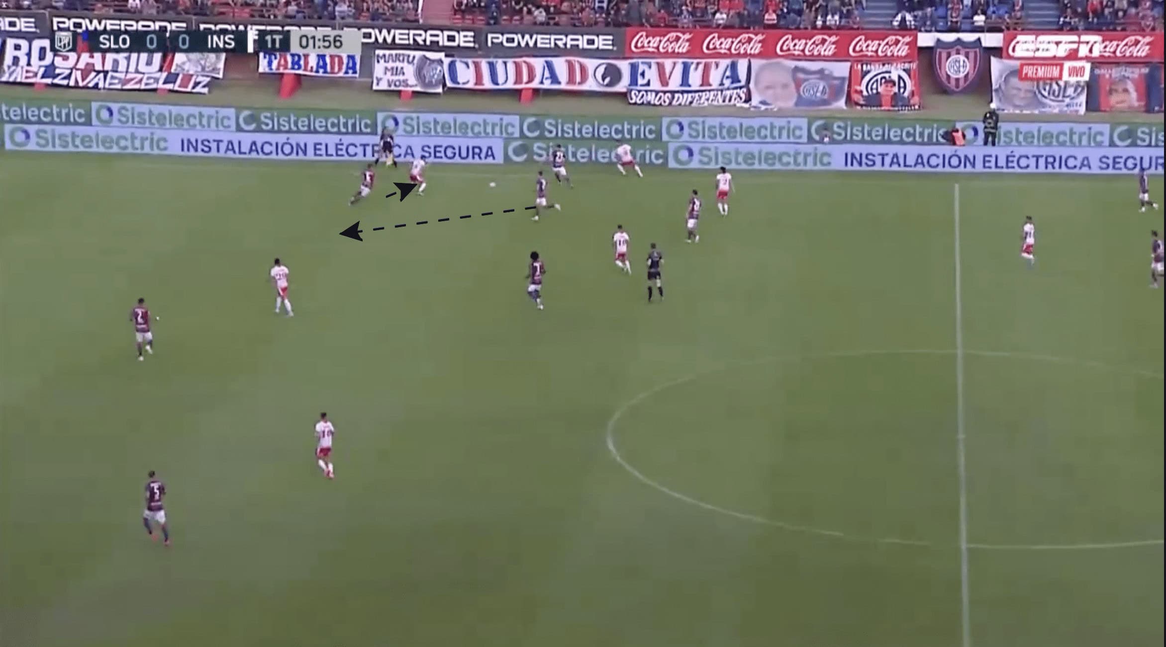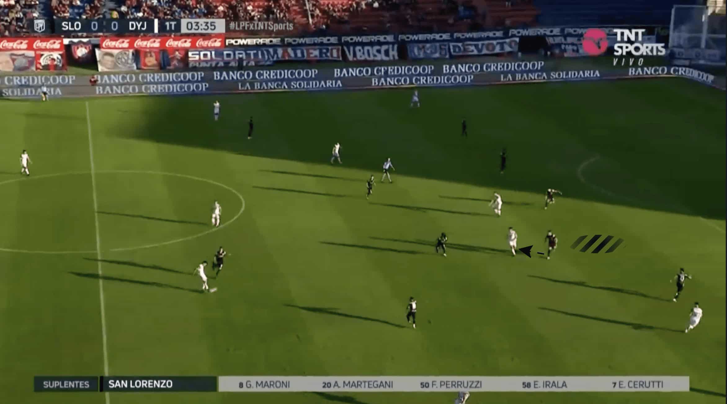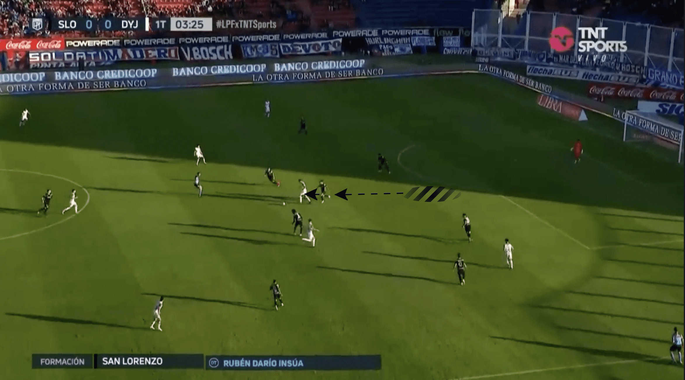 An example of this can be seen below with Sánchez adjusting his position to prevent a direct pass to the player behind him. Prior to this action, with the ball further up the pitch, Sánchez would look over his shoulder several times in order to locate the position of the opposition and make decisions in regard to his own positioning based on the position of his opponent. Additionally, the right winger, Iván Ezequiel Leguizamón, can also be seen scanning his surroundings in the image below.