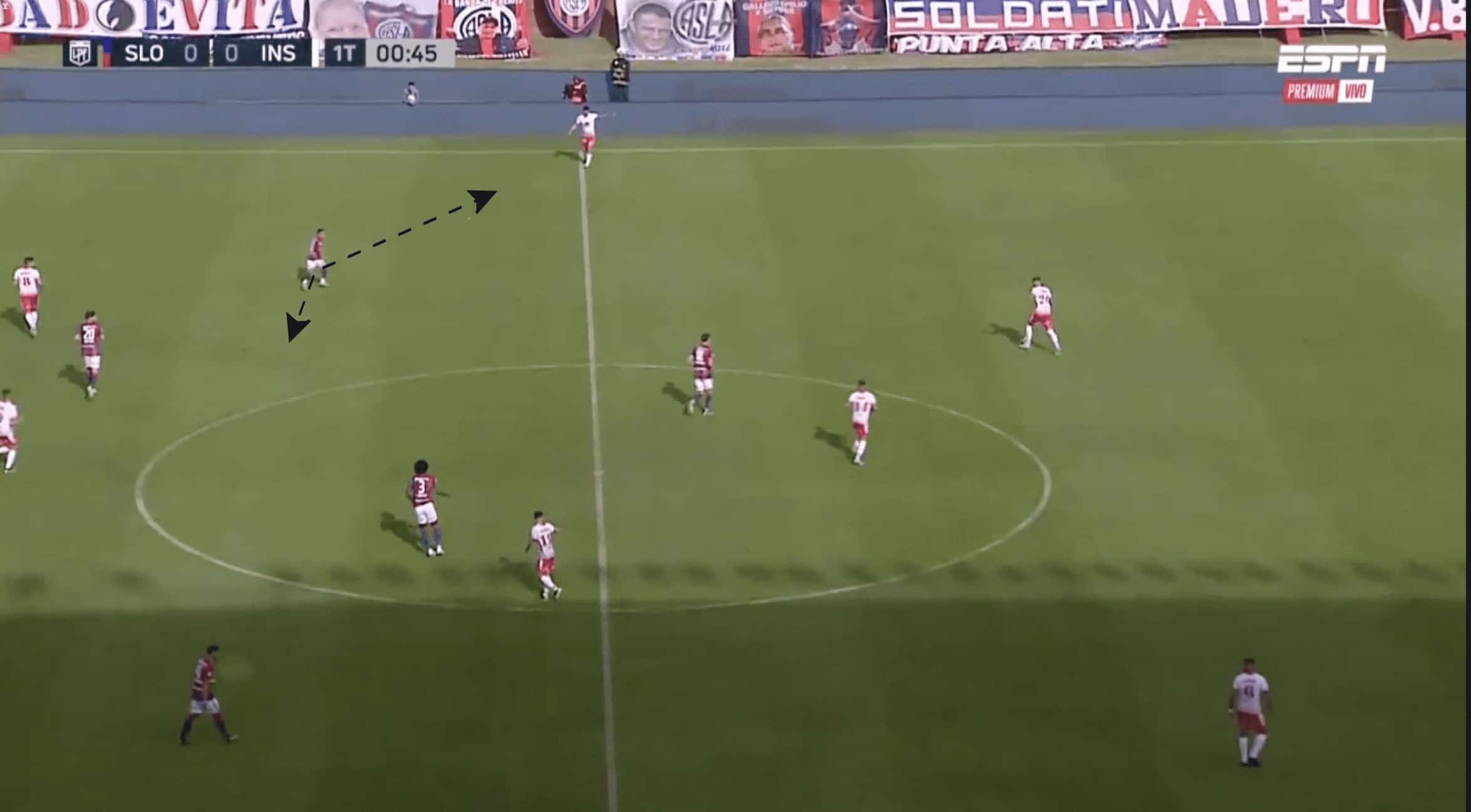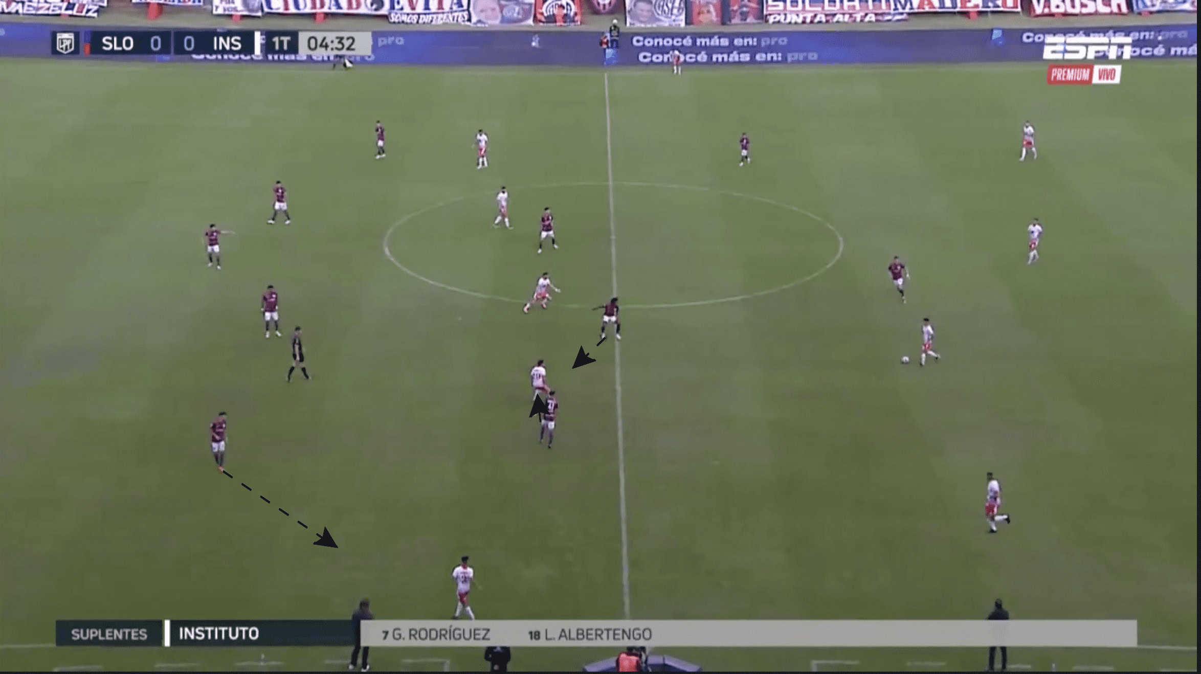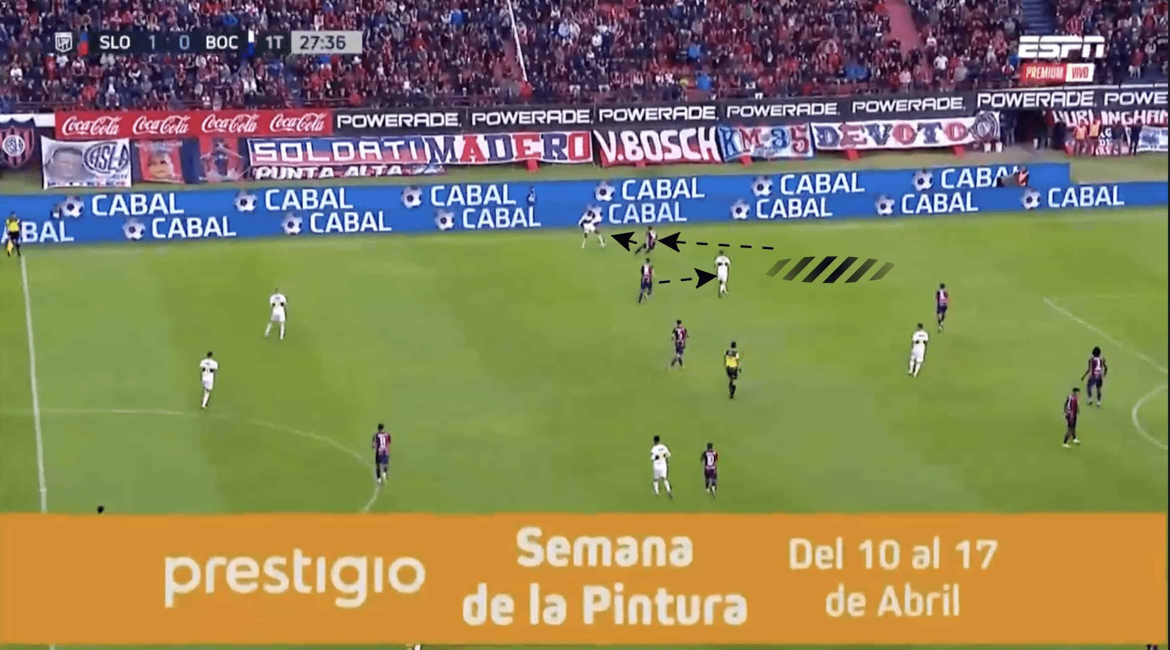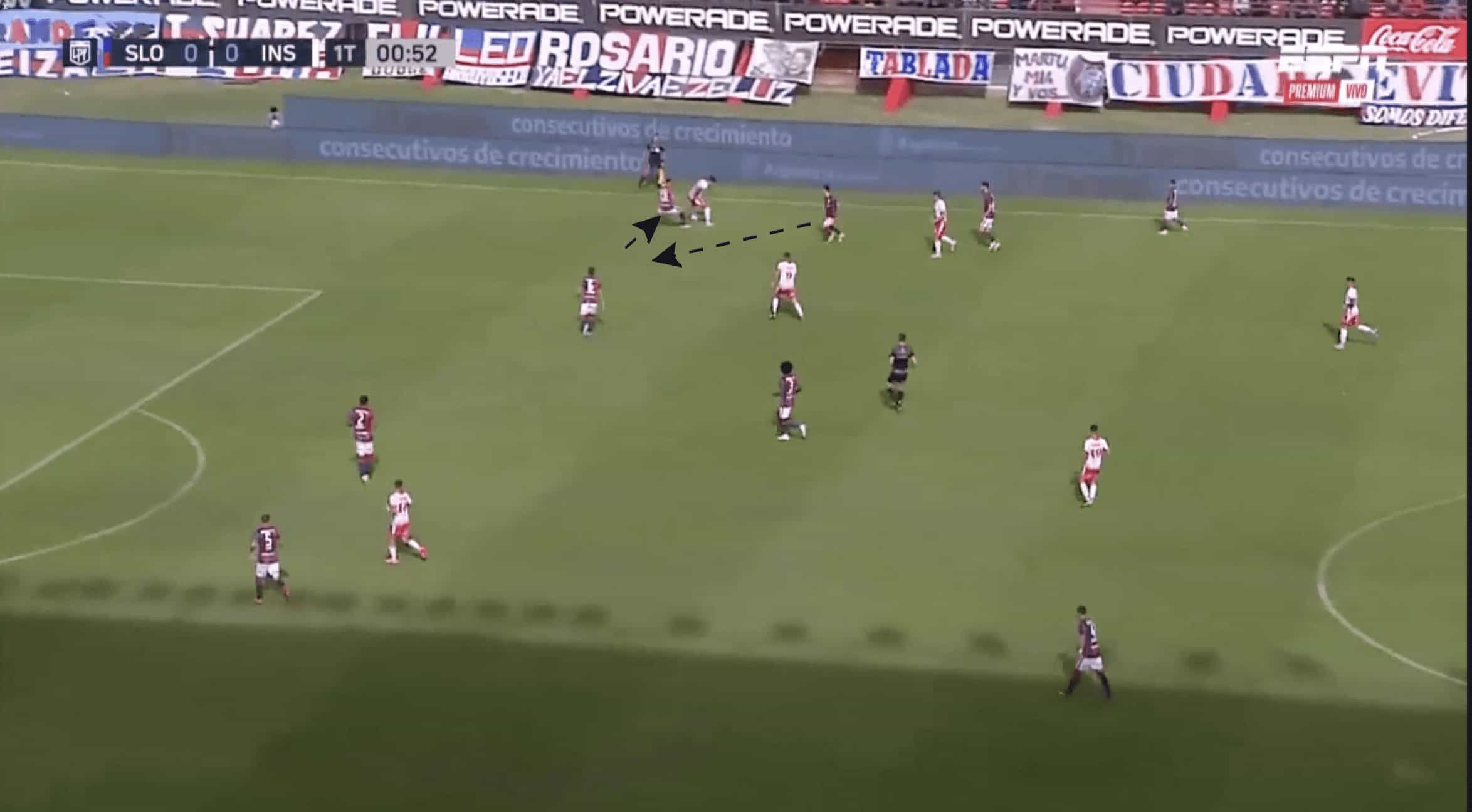 An example of this can be seen below with Sánchez adjusting his position to prevent a direct pass to the player behind him. Prior to this action, with the ball further up the pitch, Sánchez would look over his shoulder several times in order to locate the position of the opposition and make decisions in regard to his own positioning based on the position of his opponent. Additionally, the right winger, Iván Ezequiel Leguizamón, can also be seen scanning his surroundings in the image below.