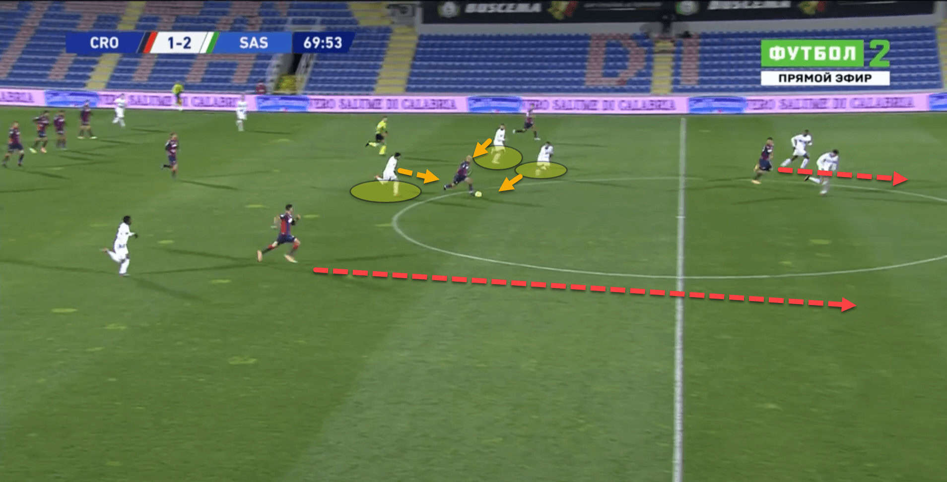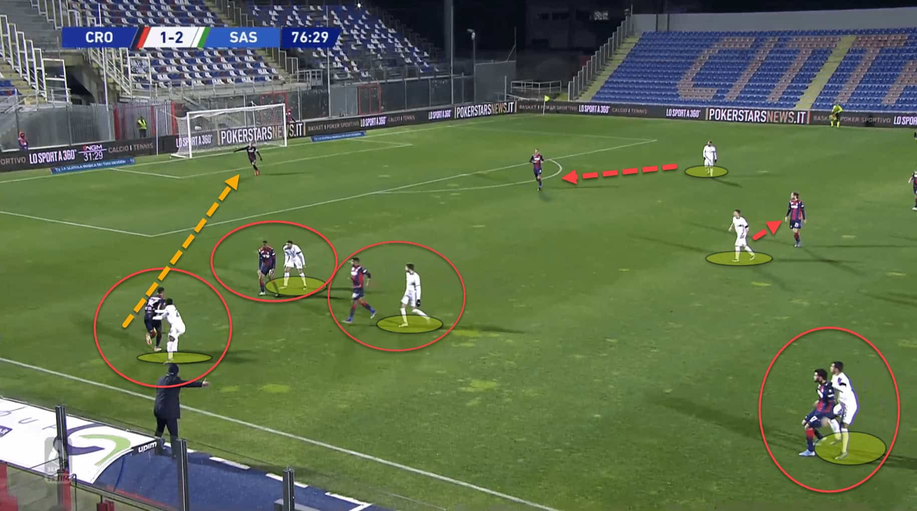 Again here, Crotone broke through Sassuolo’s counterpress and the two centre-backs were left exposed with no protection.