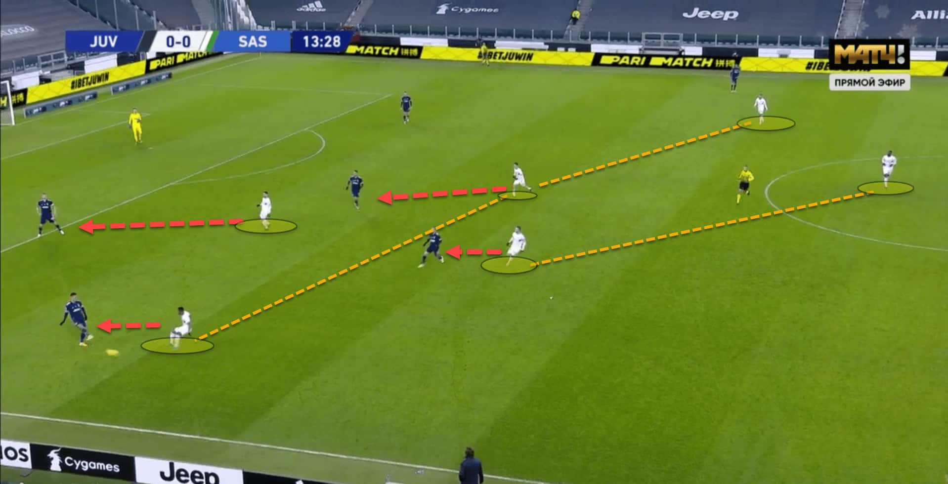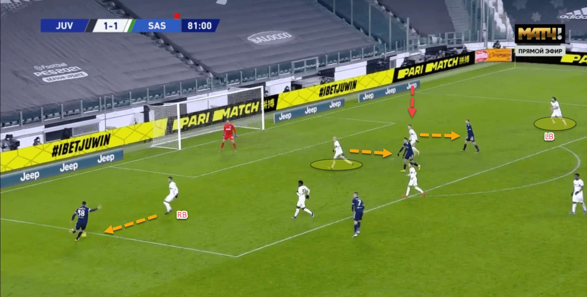 In this instance, Juventus created space successfully against Sassuolo with subtle midfield movements. Pedro Obiang has moved out of position naively to close down the passing lane to his man, Arthur Melo, whilst Traore is closing down Danilo on the ball.