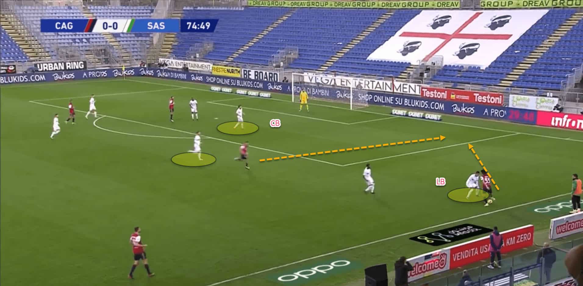For instance, in this image, Sassuolo’s left-back pushes across to close down the Cagliari player on the ball in the wide area of the pitch. The three other players in the backline do not shuffle across to close down the space left, and instead the job of plugging the halfspace is left to the ball-near defensive midfielder.