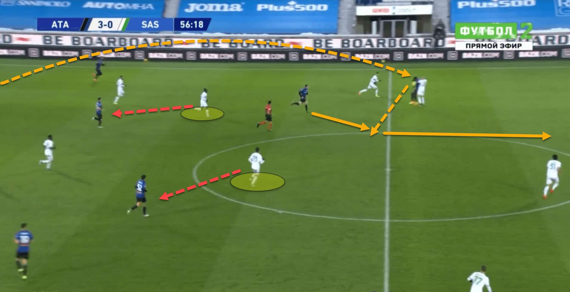 The image above is an example of Atalanta taking advantage of this space between the lines from a long ball, as well as taking advantage of Sassuolo’s backline’s lack of aerial prowess and protection.
