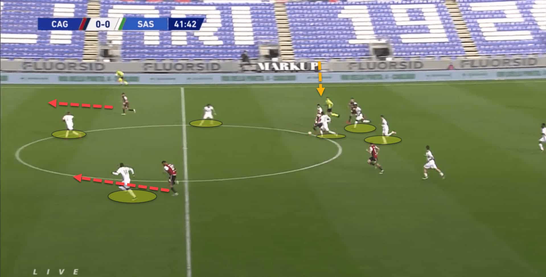 Here, Sassuolo lost the ball in the final third and used numerical superiority to try and regain possession by hunting down the player on the ball. However, Cagliari broke through the counterpress and now had a 2v2 against Sassuolo’s centre-back if the ball-carrier could play the ball forward quickly.