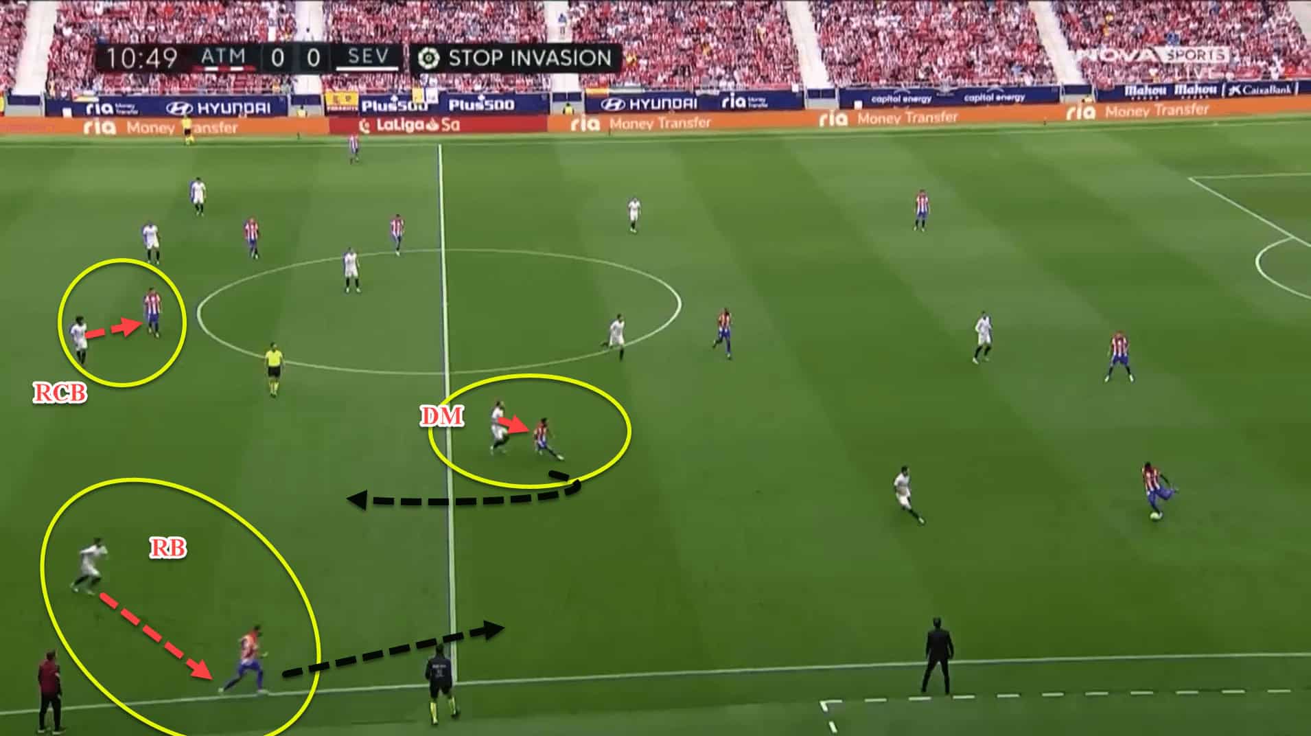 What’s noticeable about Sevilla in the defensive phases is that the team are not very compact. Players are tasked with defending optionally. Essentially, they will mark or press the closest option to them, often leaving a player they are marking to apply pressure to the ball carrier.