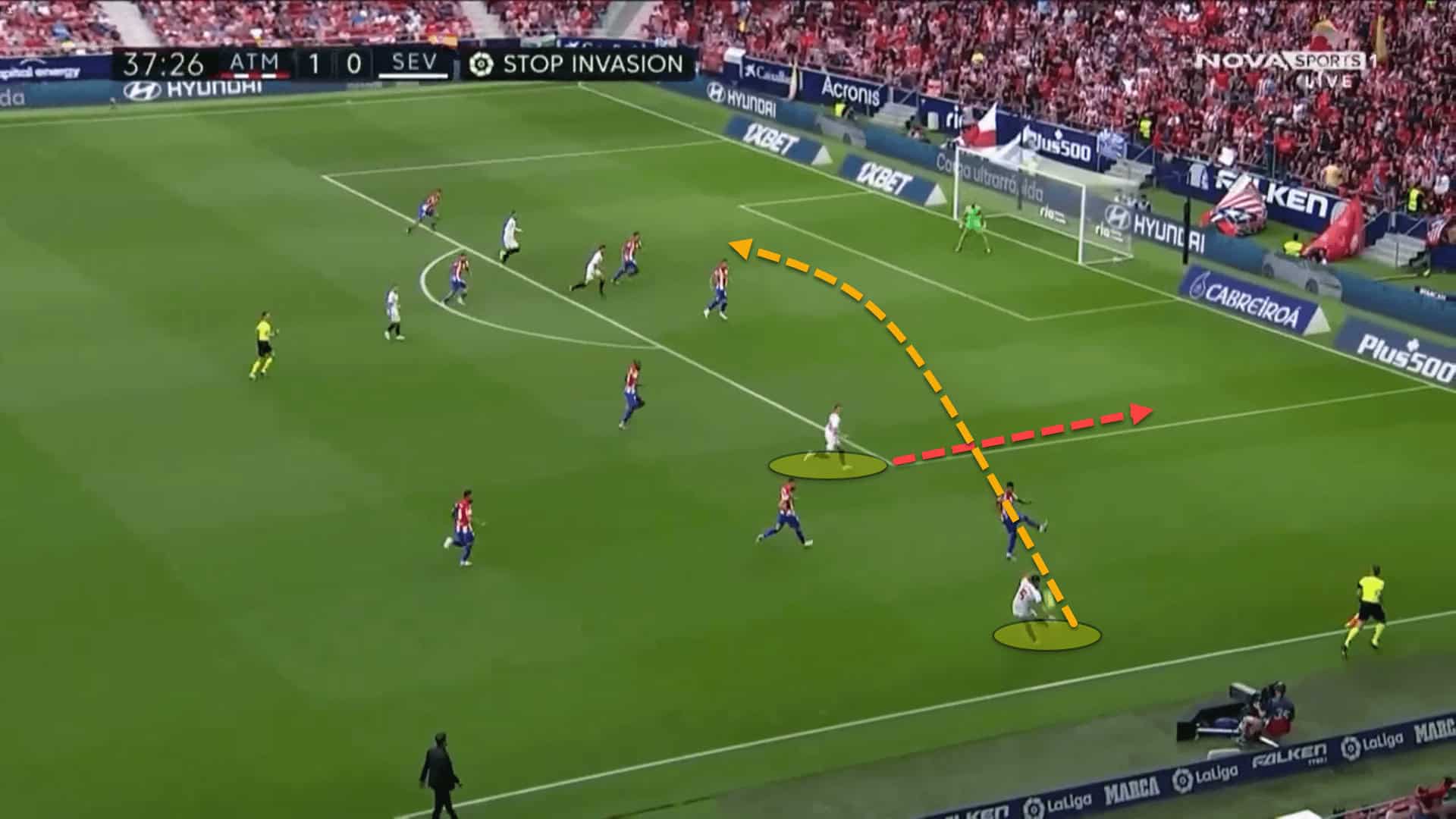 Instead, Kounde played wide to Ocampos who crossed it into the area while Rakitic continued his halfspace run in behind. The cross was easily cleared away by Diego Simeone’s dogged backline.