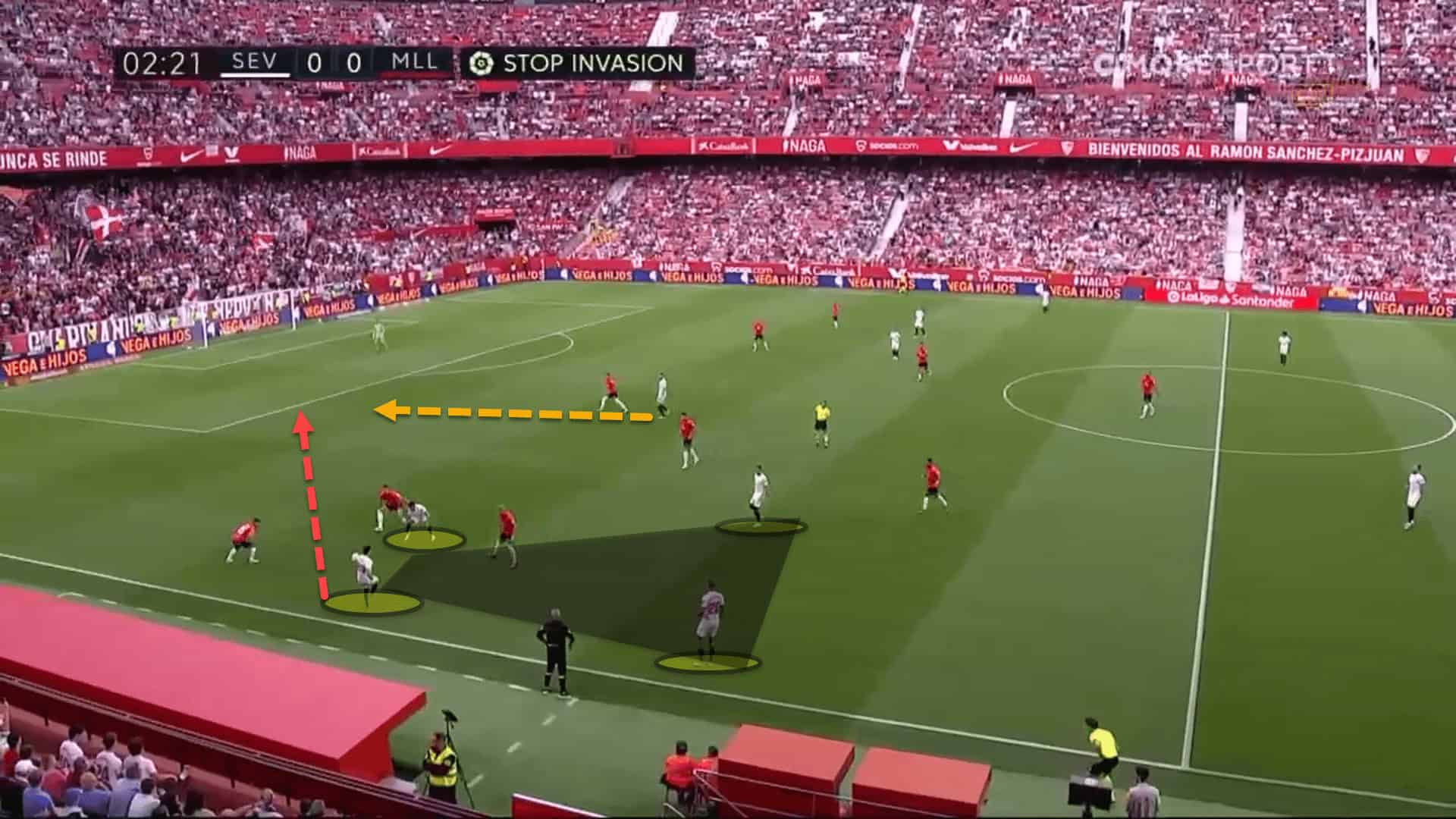 Out of possession, Sevilla are a team that want to press high and get in the faces of the opposition, trying to win the ball in dangerous areas of the field by forcing the ball carrier into making mistakes.