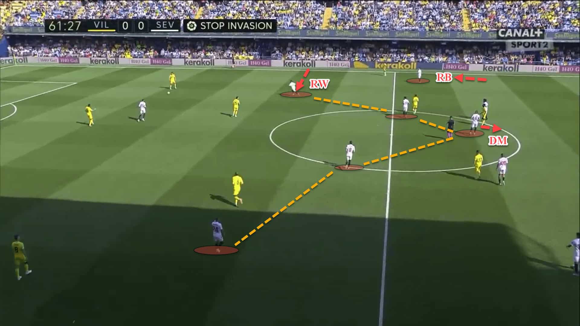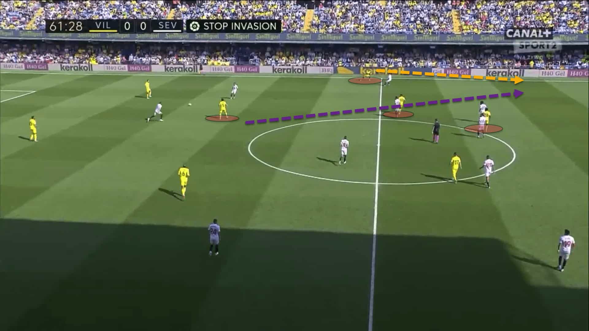 Villarreal would constantly ensure that Sevilla’s players were occupied and pinned down. Emery’s centre-forward had pinned Sevilla’s right centre-back, leaving the right-back with a 1v1 situation over on the left flank.